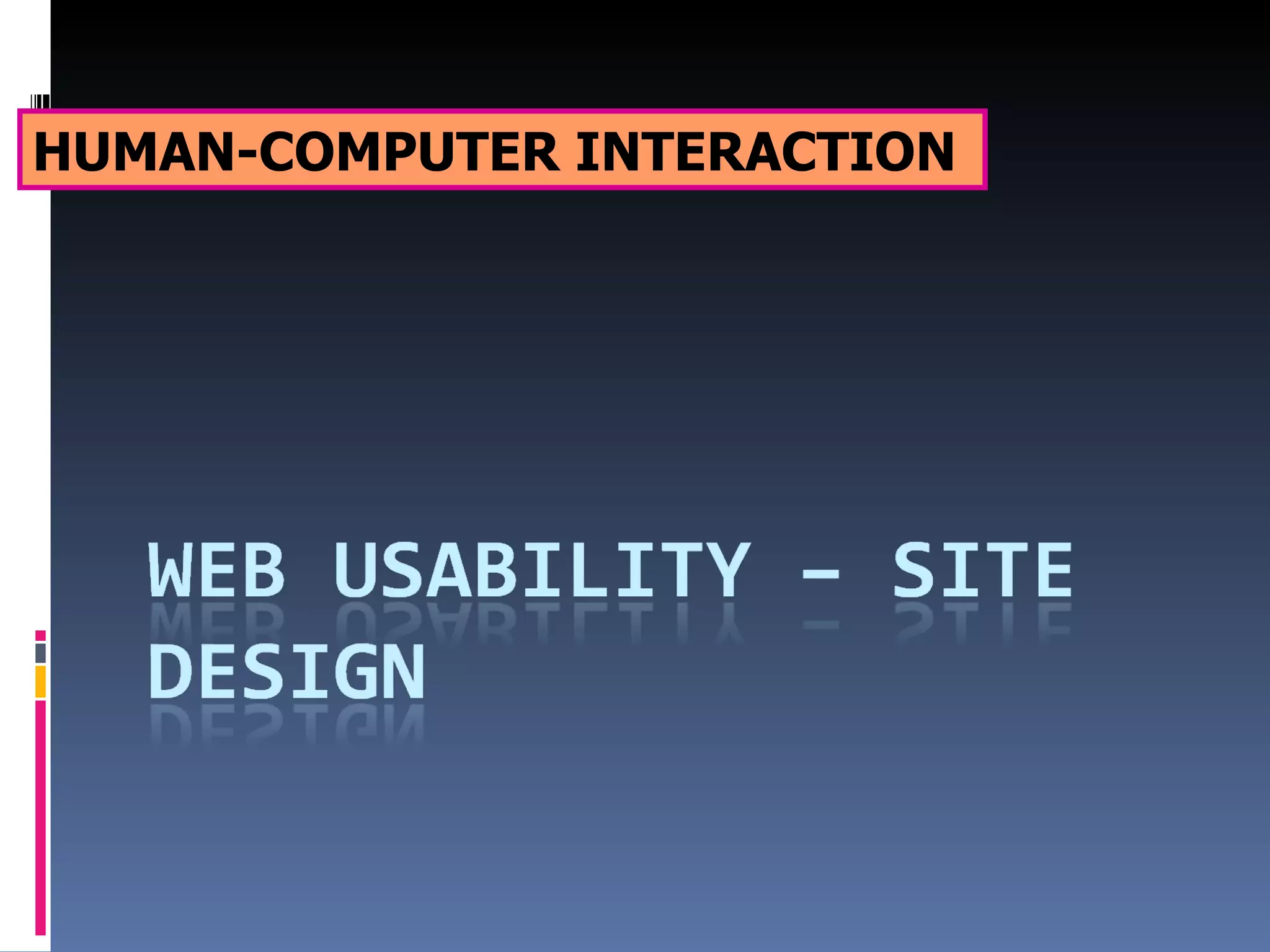 The document provides guidance on web site design and usability. It discusses that the home page should welcome users and clearly explain what the site offers through navigation, important news/promotions, and a search feature. Interior pages should focus on specific content and include consistent navigation back to the home page. Site structures should reflect the user's goals rather than the organization of the company. Users should be given freedom of movement and navigation between pages and sites.