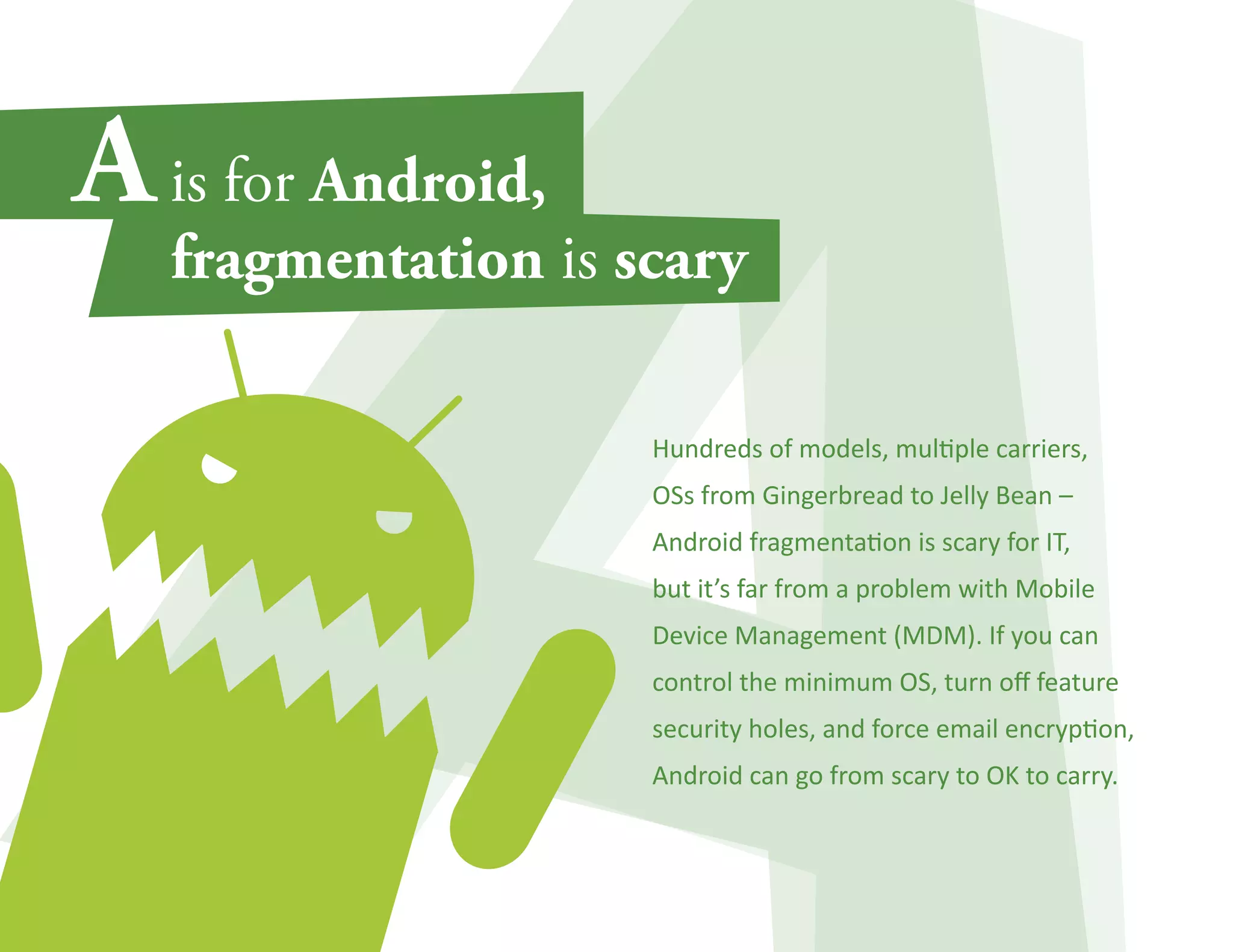 The document discusses the benefits of Mobile Device Management (MDM) for both IT departments and end users. MDM allows IT to securely manage mobile devices including configuring security settings, distributing documents and apps, and enforcing policies. It simplifies tasks for IT like remote enrollment and troubleshooting issues. For end users, MDM ensures corporate data is protected while allowing users to access resources through their personal devices. The document recommends organizations try out MDM solutions to experience these benefits.