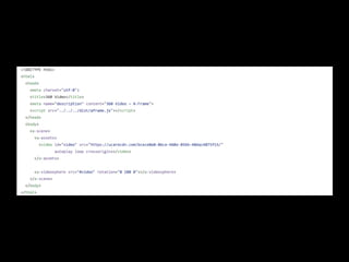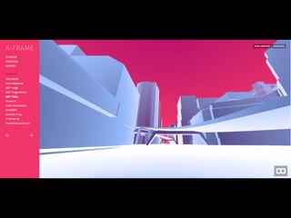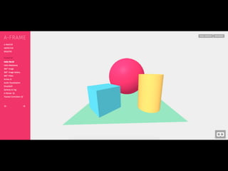 WebVR is an experimental JavaScript API that allows access to virtual reality devices like Oculus Rift and HTC Vive in the browser. It aims to bring VR experiences to the web in an interoperable and device agnostic way. WebVR works by using a WebVR enabled browser along with libraries like AFrame or three.js to build and display VR scenes and experiences. AFrame uses entities and components to build scenes in a declarative way and supports features like 3D models, sounds, animations and controls.