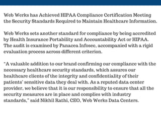 Web Werks has achieved HIPAA Compliance Certification after passing an audit from Panacea Infosec. This certification confirms that Web Werks' infrastructure and security measures meet the standards required to securely store protected healthcare information. As a data center provider serving healthcare clients, Web Werks believes it is important to ensure all necessary security protocols are followed to protect sensitive patient data. The certification examines physical, technical, and network security controls at Web Werks' data centers.