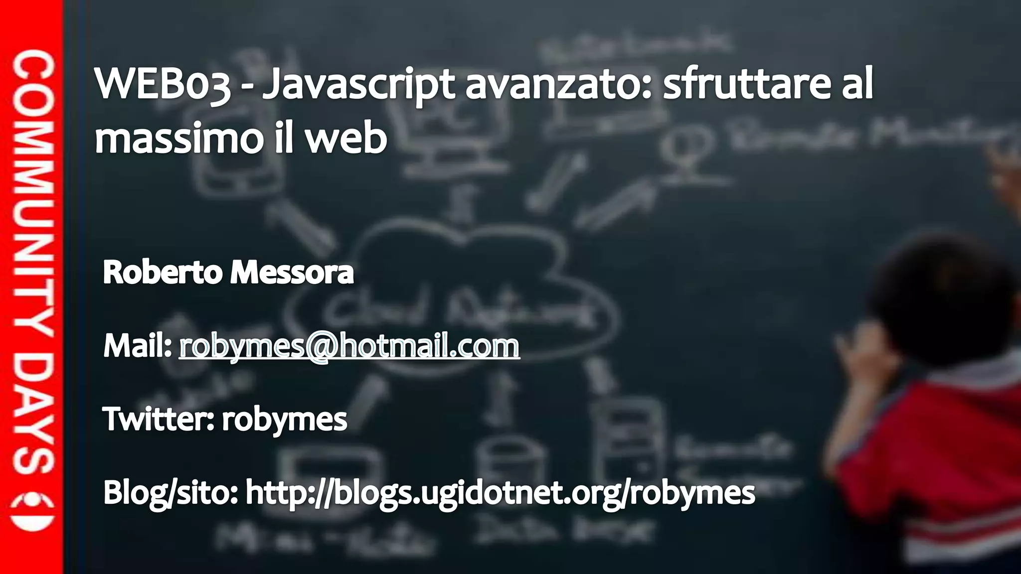 Il documento discute l'importanza dell'organizzazione della codebase in JavaScript, evidenziando la necessità di utilizzare pattern strutturali e idiomatici per migliorare la manutenibilità del codice. Viene fornita una panoramica sulla storia di JavaScript e si sottolinea che, contrariamente a quanto si possa pensare, non è un linguaggio simile a Java e possiede un formalismo unico. Infine, vengono analizzati vari pattern come namespace e module pattern, insieme alle caratteristiche fondamentali del linguaggio come lo scoping, le closure e l'ereditarietà.