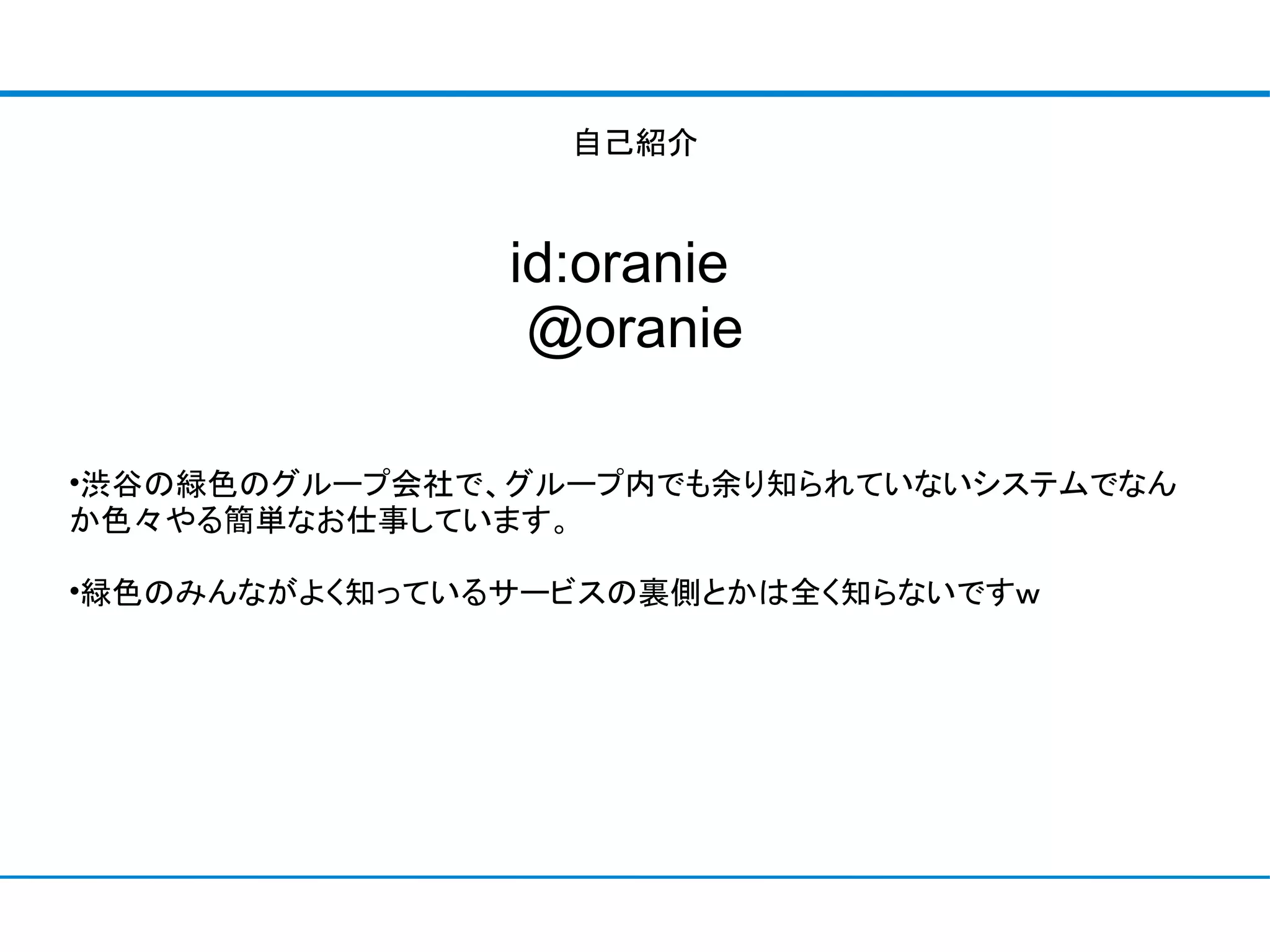 id:oranie @oranie •渋谷の緑色のグループ会社で、グループ内でも余り知られていないシステムでなん か色々やる簡単なお仕事しています。 •緑色のみんながよく知っているサービスの裏側とかは全く知らないですw