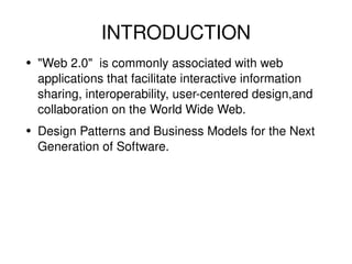 Web 2.0 refers to web applications that facilitate interactive information sharing, user-centered design, and collaboration on the World Wide Web. Examples include social networking sites like Facebook and Twitter, video sharing sites, wikis, and blogs. Social networks consist of individuals or organizations connected by relationships. RSS allows users to subscribe to continually updated content from sites through a feed reader. APIs enable interaction and sharing of content between applications and sites. Widgets are embeddable applications that can turn personal content into dynamic web apps shared on websites.