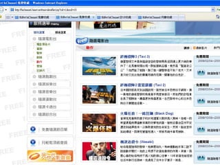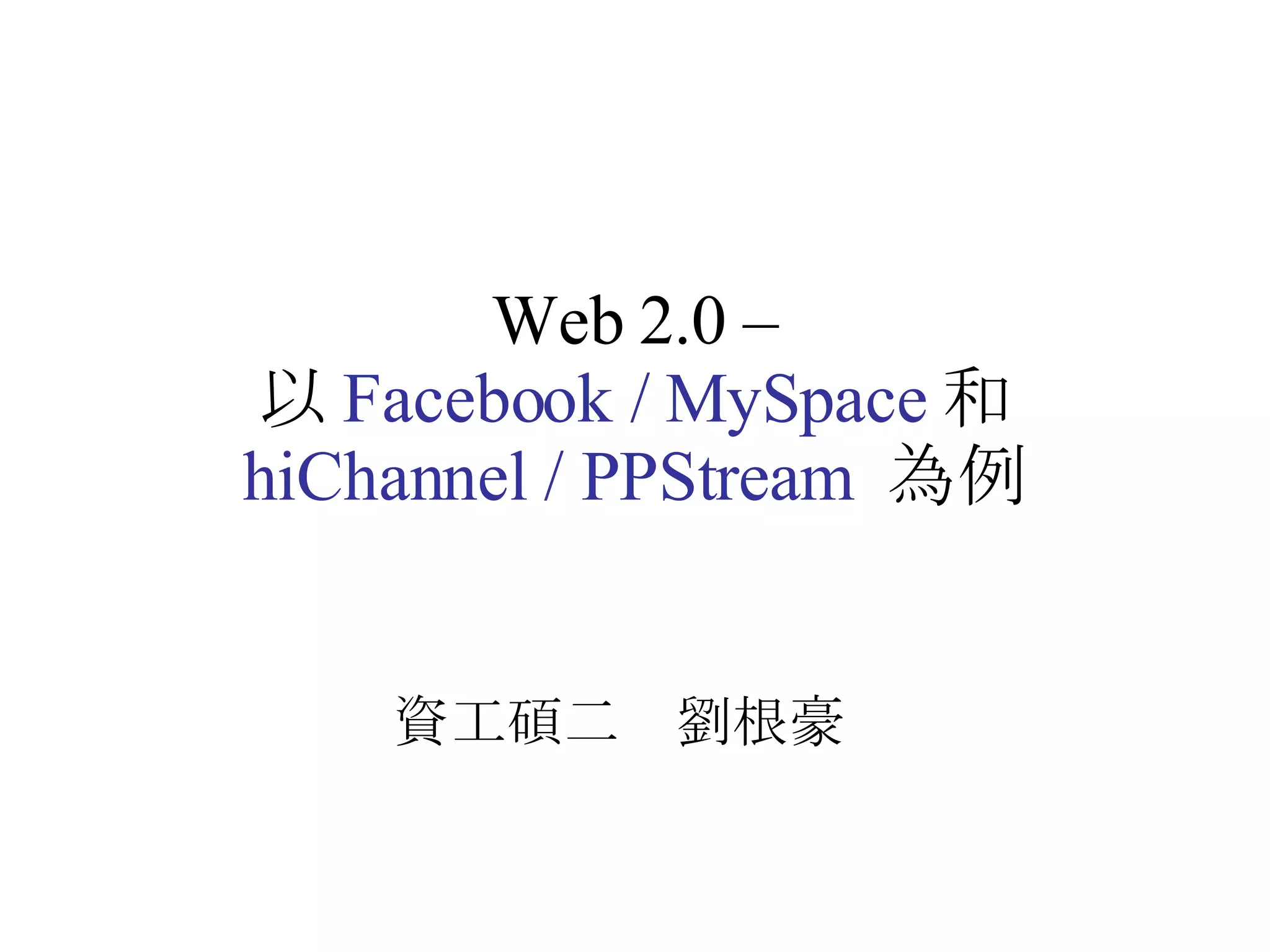 Web 2.0 Typicalapplication Blog 部落格 : 無名, Blogger Microblog 微型部落 : twitter, buboo Podcast: Podcast.com RSS: 訂閱服務 SNS: Facebook, MySpace, Unis Multimeda: YouTube, Flickr, hiChannel, PPStream Advertising: Google AdSense Tag: 標籤,關鍵字搜尋 Wiki: wikipedia