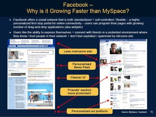 Facebook 的策略 策略2: 利用廣告 (banner ads) 賺錢 訂定能使兩邊客群需求平衡的價格 65% of users logging in daily, 85% weekly 85% of college students $300 million, 2008 est.
