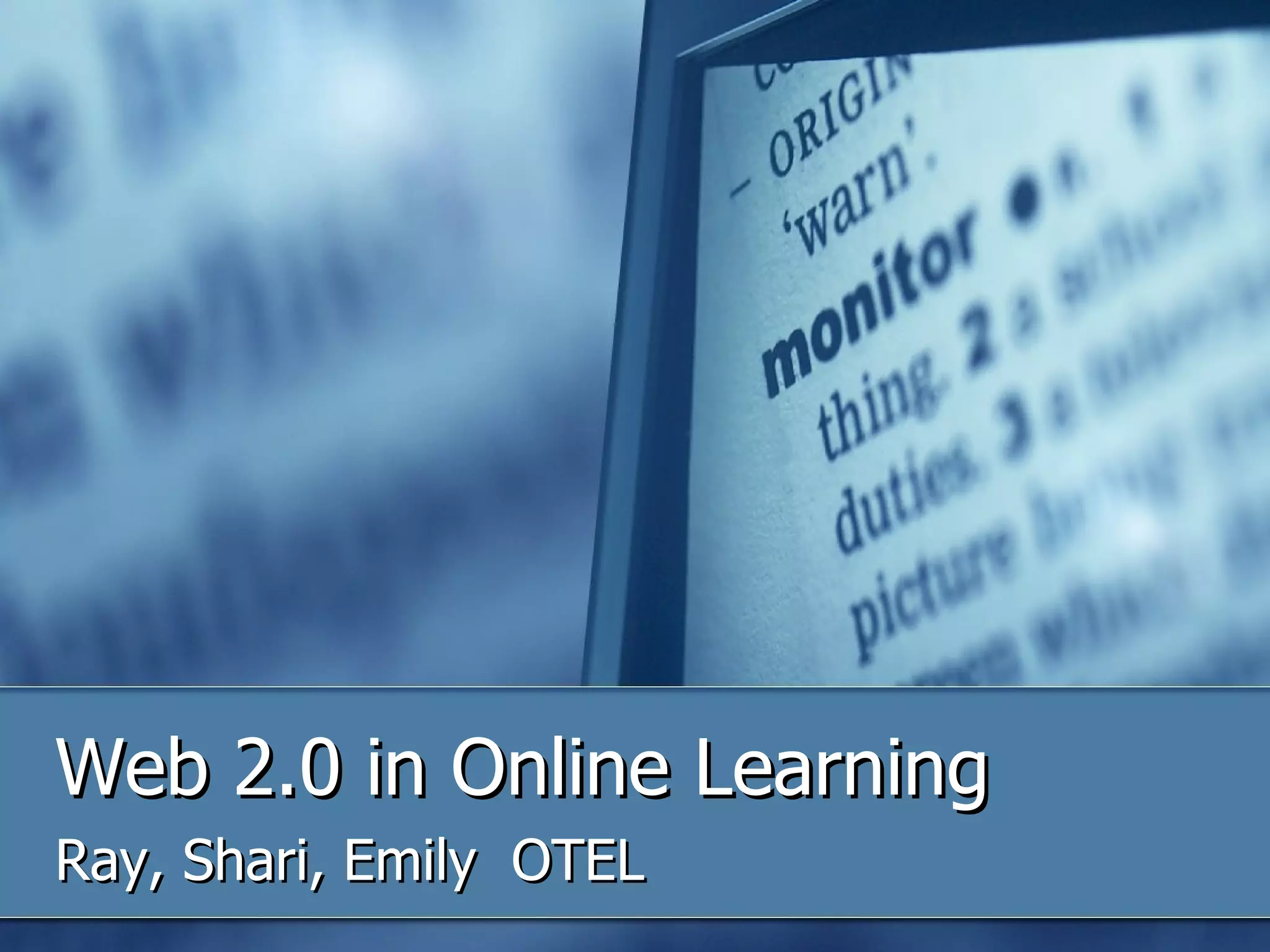 This document provides an introduction to Web 2.0 tools that can enhance online learning. It discusses technologies like Ajax, wikis, blogs, RSS feeds, and social bookmarking/tagging that allow for more dynamic and interactive content. Specific Web 2.0 tools are also highlighted, such as Google Docs, Flickr, YouTube, and social media/bookmarking sites. The goal is to illustrate how these new technologies can engage students and support collaboration in online learning environments.