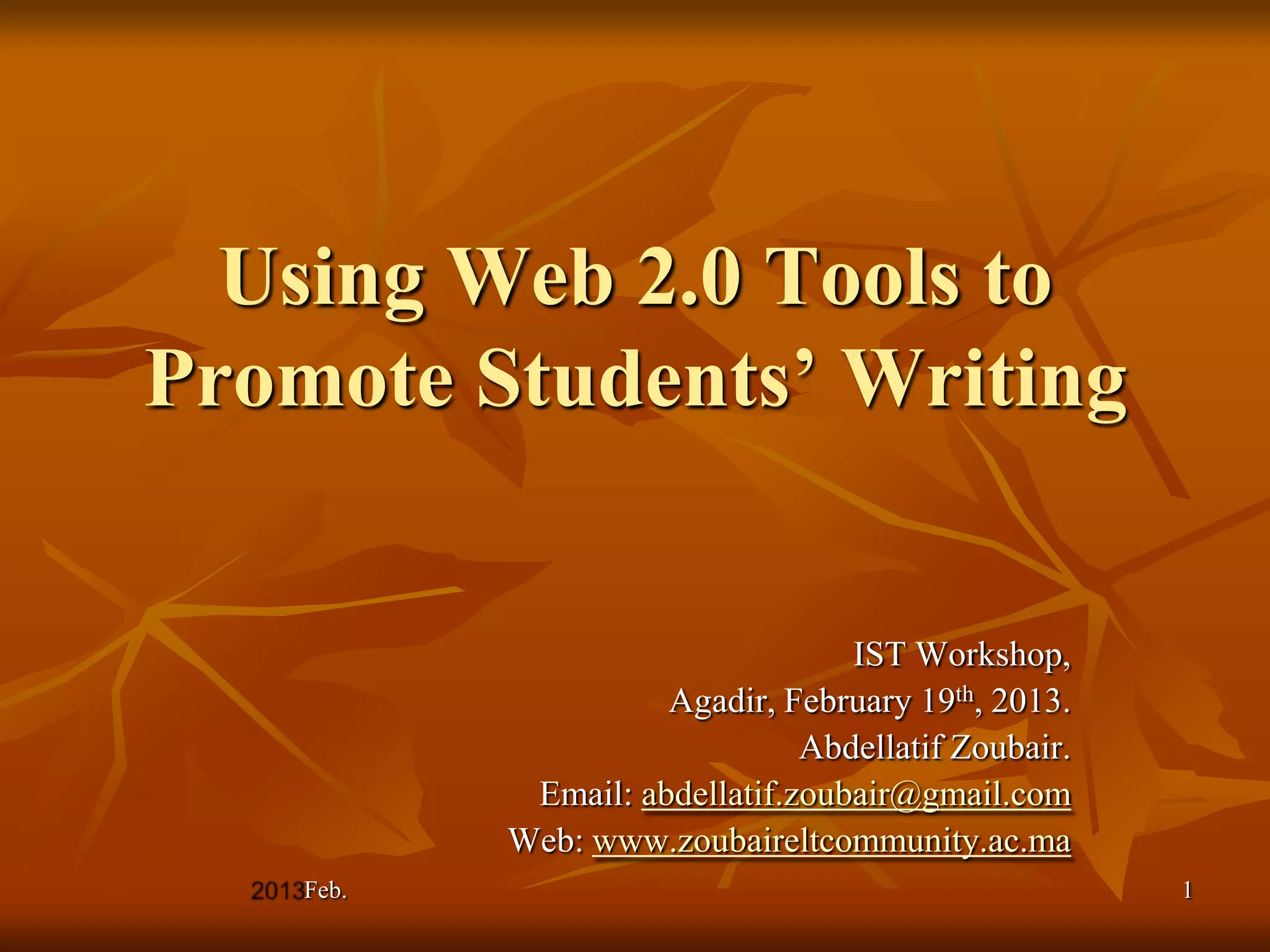 This document discusses using Web 2.0 tools to promote student writing. It begins by outlining the workshop agenda and reviewing basic writing concepts. Common student writing challenges are identified, such as issues with grammar, spelling, and expressing ideas coherently. The document then explores sample Web 2.0 tools that could help address these challenges. It concludes by recommending teachers reconsider their practices to incorporate relevant digital tools and resources into writing instruction.