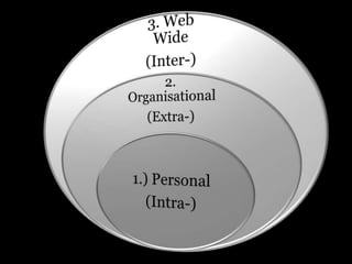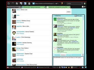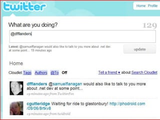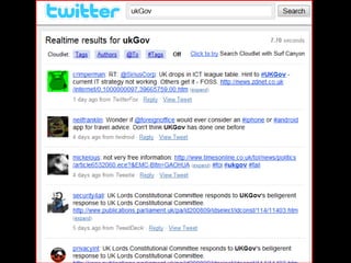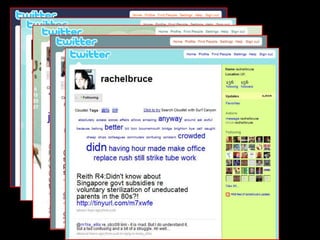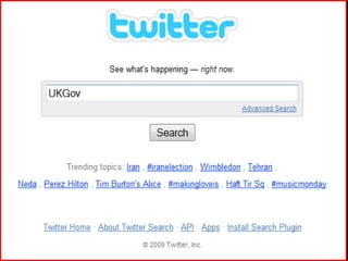 The document discusses the utilization of Web 2.0 tools by individuals and organizations in the public sector to address information overload, build community, and enhance content creation. It highlights strategies for monitoring online activities and engaging with the public transparently, emphasizing the importance of using accessible platforms like Twitter and blogs for communication. Activities and worksheets are included to promote active participation and practical application of these concepts.