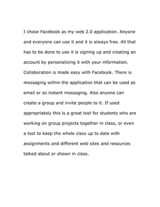 Facebook was chosen as a web 2.0 application that anyone can use for free by creating a personalized account. It facilitates collaboration through messaging like email or instant messaging. Users can also create groups and invite people to join, making it a useful tool for students collaborating on group projects or keeping entire classes updated on assignments, websites, and resources.