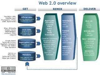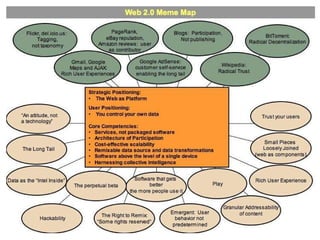 Web 2.0 refers to a second generation of web development and design that facilitates sharing and collaboration on the internet. It is characterized by services that get better the more people use them, consume and remix data from multiple sources, and that empower users to create and edit content in a format that allows easy mixing and remixing by others. While difficult to precisely define, Web 2.0 focuses on harnessing collective intelligence, openness, network effects, and user experiences delivered through the browser as a platform rather than traditional software.