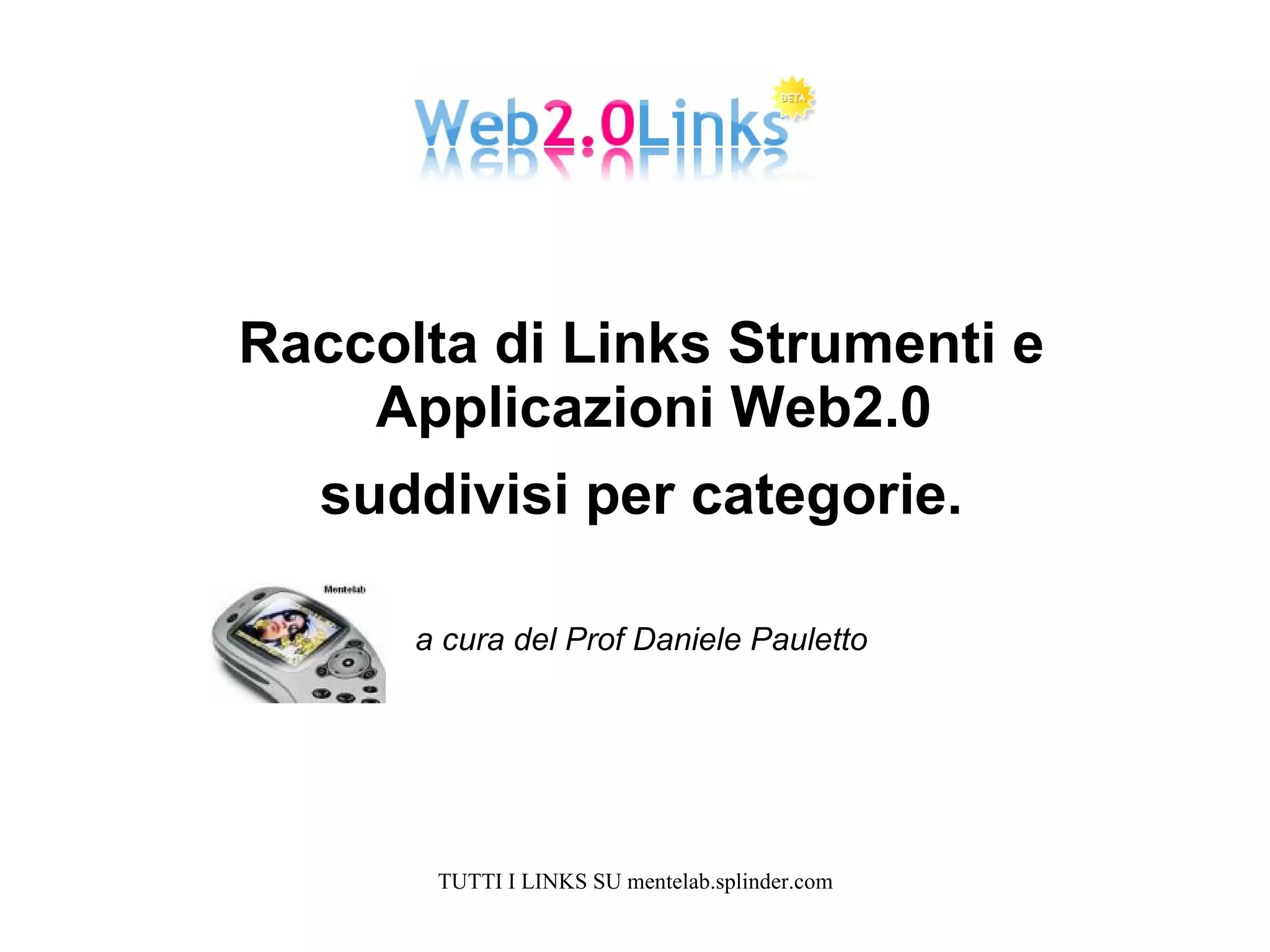 The document provides a list of various web tools, applications, and websites organized into different categories such as image editing tools, logo makers, search engines, calendars and planners, music and video sharing sites, blogging platforms, and social networking sites. Some of the categories included are web tools, image hosting and editing, logo makers, search engines and meta search engines, calendars and event planners, music downloads and streaming, video sharing, blogging applications, and social networks.