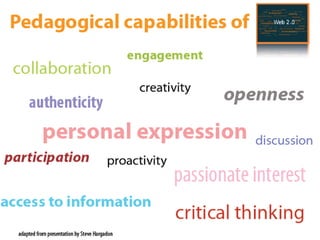 The document discusses the future of education and how social media and Web 2.0 tools can be integrated into teaching and learning. It defines social media and Web 2.0 technologies as read-write platforms that allow users to create and share content. Various social media tools are described, including social networking, bookmarking, wikis, blogs, and media sharing, along with examples of tools for each category. Potential uses of social media for both formal education and informal learning are outlined.