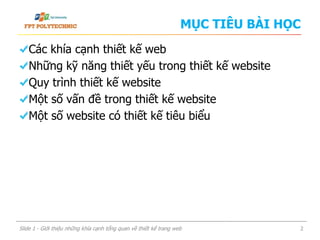 Tài liệu trình bày tổng quan về thiết kế web, bao gồm các khía cạnh như nội dung, trình bày và các yếu tố khác ảnh hưởng đến trải nghiệm người dùng. Nó cũng đề cập đến quy trình thiết kế website và những kỹ năng cần thiết, cùng với một số vấn đề cần quan tâm như khả năng truy cập và tính tiện dụng. Cuối cùng, tài liệu đưa ra ví dụ về các website có thiết kế tiêu biểu.