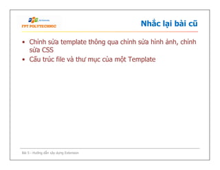 Bài hướng dẫn này trình bày quy trình xây dựng extension trên Joomla, bao gồm cách thức tạo component và module theo mô hình MVC. Bài viết đề cập các tệp cần thiết cho component như controller, view, model, và cách đóng gói thành file cài đặt. Cuối cùng, bài học nhấn mạnh sự tương đồng trong quá trình xây dựng các component và module trên nền tảng Joomla.