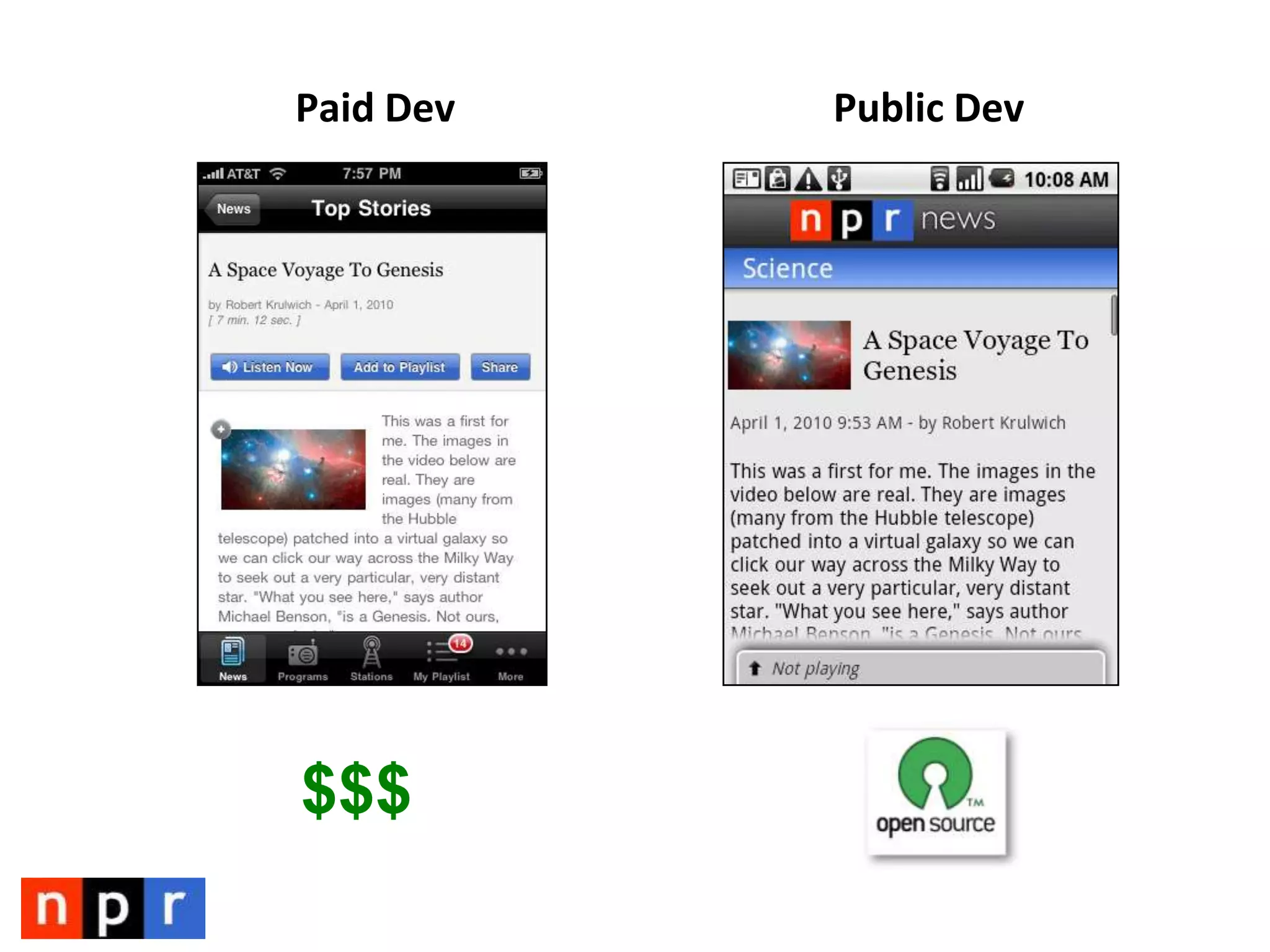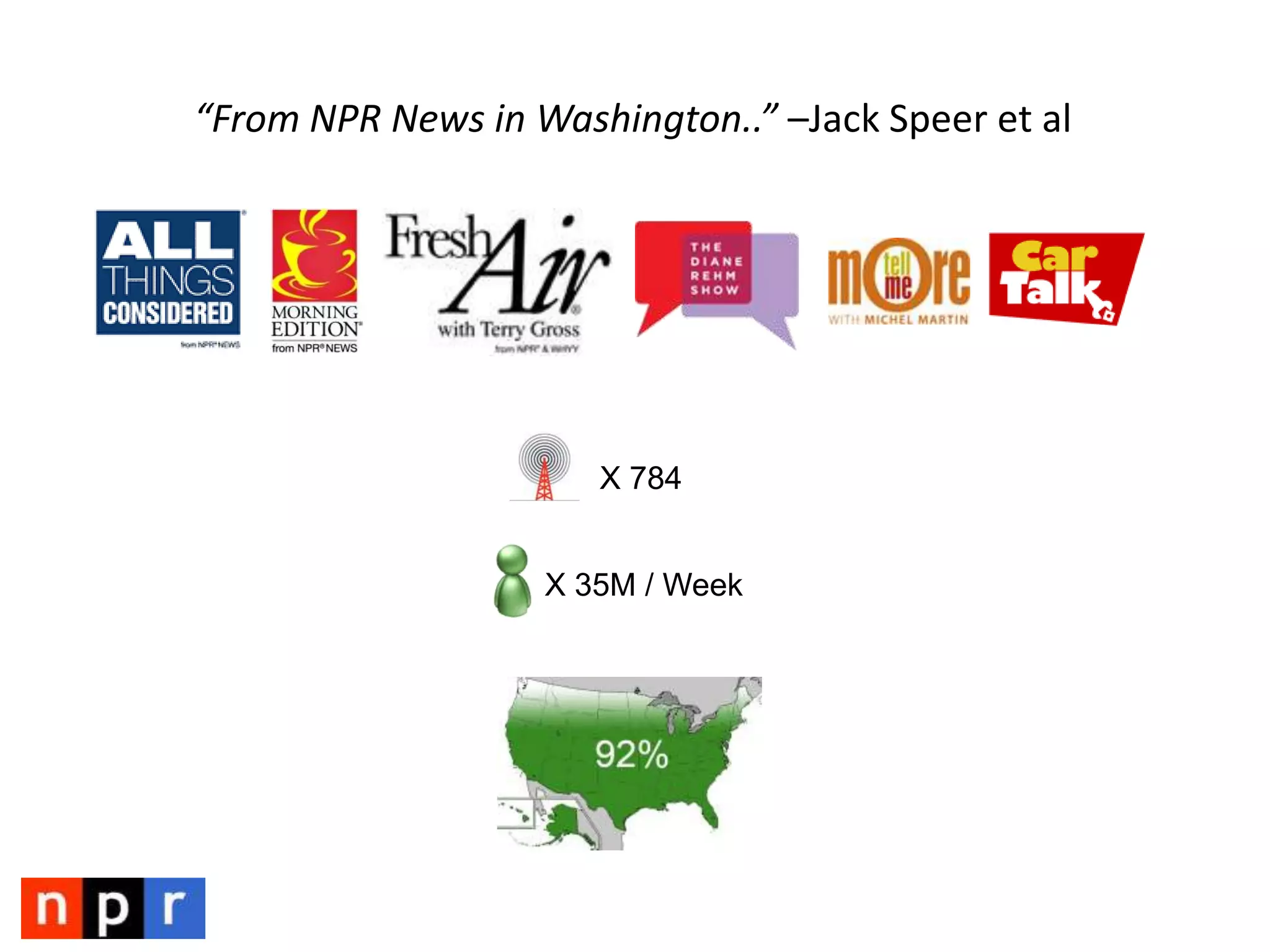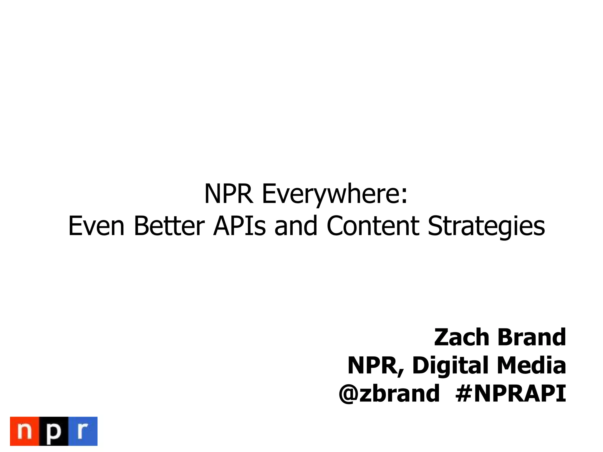 The document discusses NPR's digital media strategy, specifically focusing on their use of APIs and a crossmedia content management system known as COPE (Create Once Publish Everywhere). It outlines the goals and principles behind the NPR API, emphasizing improved development efficiencies and content distribution flexibility, as well as lessons learned from implementing the API. The text also highlights the architectural improvements and challenges associated with maintaining and adapting the API for mobile and partner applications.