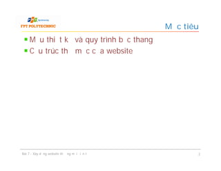 Bài 7 trình bày quy trình xây dựng website thương mại điện tử bao gồm mẫu thiết kế, cấu trúc thư mục và các trang chính như trang chủ, catalog, giỏ hàng, tài khoản và thanh toán. Nó nhấn mạnh lợi ích của việc sử dụng mẫu thiết kế để phát hiện vấn đề sớm và giảm chi phí. Các trang dành cho người quản trị cũng được giới thiệu để quản lý sản phẩm, danh mục, đơn hàng và tài khoản.