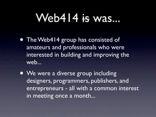 Web414 was a group that met monthly in Milwaukee from 2006 to 2011 for people interested in web technologies. The group consisted of amateurs and professionals from diverse backgrounds including designers, programmers, publishers and entrepreneurs who shared a common interest. Over the years, Web414 hosted many events and discussions on topics such as content management systems, web design, development frameworks, and more. It inspired the creation of other local technology meetup groups. After over five years, the future of Web414 is uncertain as this document reflects on the past accomplishments and impact of the group.