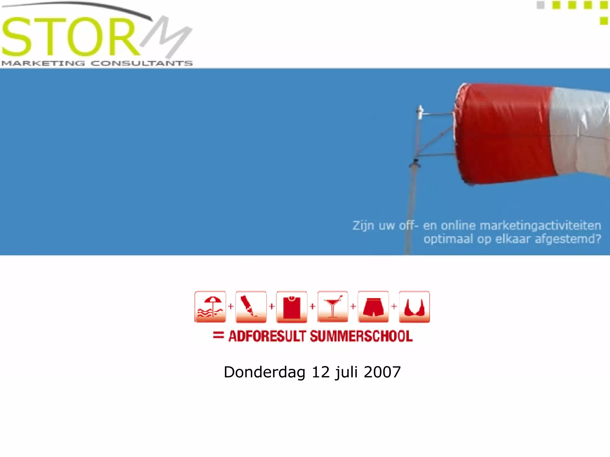 StormMC, aangenaam! StormMC= Storm Marketing Consultants Sinds augustus 2006 Gevestigd op de Grote Markt te Groningen Hiervoor: Traffic4u, zoekmachine marketing StormMC werkt voor o.a.: Stichting AAP, De Telegraaf Mediagroep, Afab, Bosch, All-In-Solo, NoRRoD, Canvas Company, Niki.nl, Noorder Dagblad Combinatie, Dokkumer Vlaggen Centrale, KIESKEURIG.