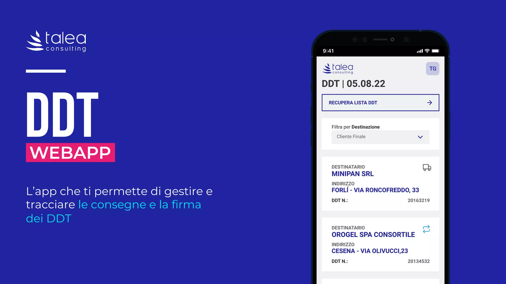 L'applicazione permette di gestire e tracciare le consegne e le firme dei documenti di trasporto (ddt) attraverso una webapp configurabile e integrata con software aziendali. I principali processi includono l'acquisizione, la gestione della consegna e dell'incasso, nonché il tracciamento delle consegne effettuate. Il sistema garantisce una gestione documentale sicura e ottimizzata attraverso flussi di lavoro automatizzati e reportistica dettagliata.