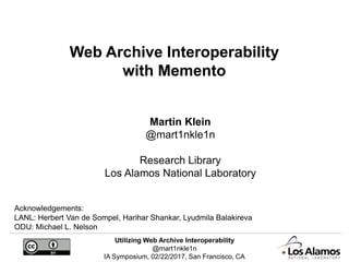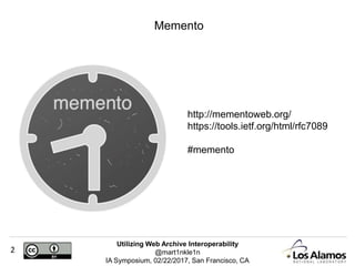 The document discusses utilizing web archive interoperability with Memento, which provides a framework for integrating and searching across multiple web archives. It describes how Memento acts as a bridge between original web resources and archived versions (mementos) and aggregates data from different archives to allow searching across them. Examples are given of Memento tools and applications that enable time travel functionality and robust links via link decoration.