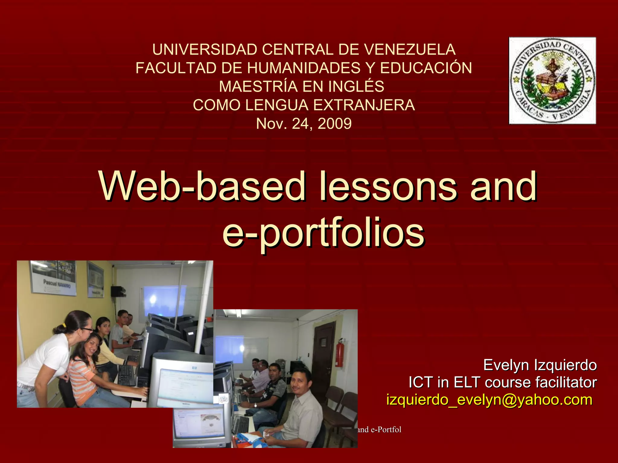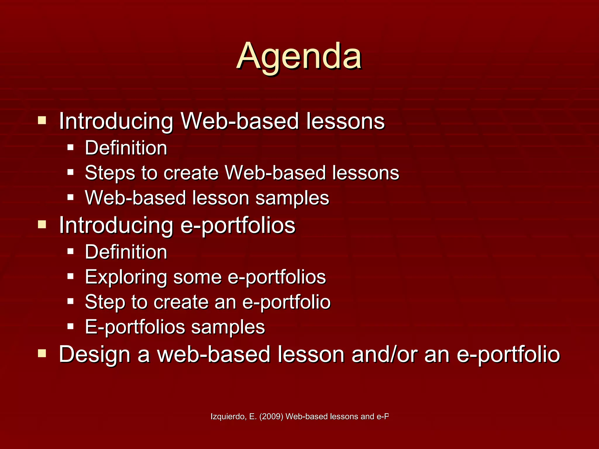 This document discusses web-based lessons and e-portfolios. It defines a web-based lesson as a lesson that incorporates websites, which can be conducted entirely online or as a supplement to traditional lessons. E-portfolios are collections of student work and reflections that can demonstrate learning. The document provides guidelines for creating web-based lessons and e-portfolios, including selecting websites, incorporating student reflections, and using tools like blogs. Examples of existing web-based lessons and e-portfolios are also included.
