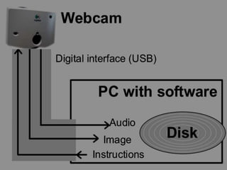 The document discusses the history of webcams, starting from the first webcam developed in 1991 at Cambridge University to the introduction of commercial webcams in 1994. It outlines the technology behind webcams, including their components and functionality, as well as their applications in video chat, automation, and video messaging. Webcams have evolved significantly, offering various features and capabilities for personal and professional use, particularly in streaming media and remote monitoring.