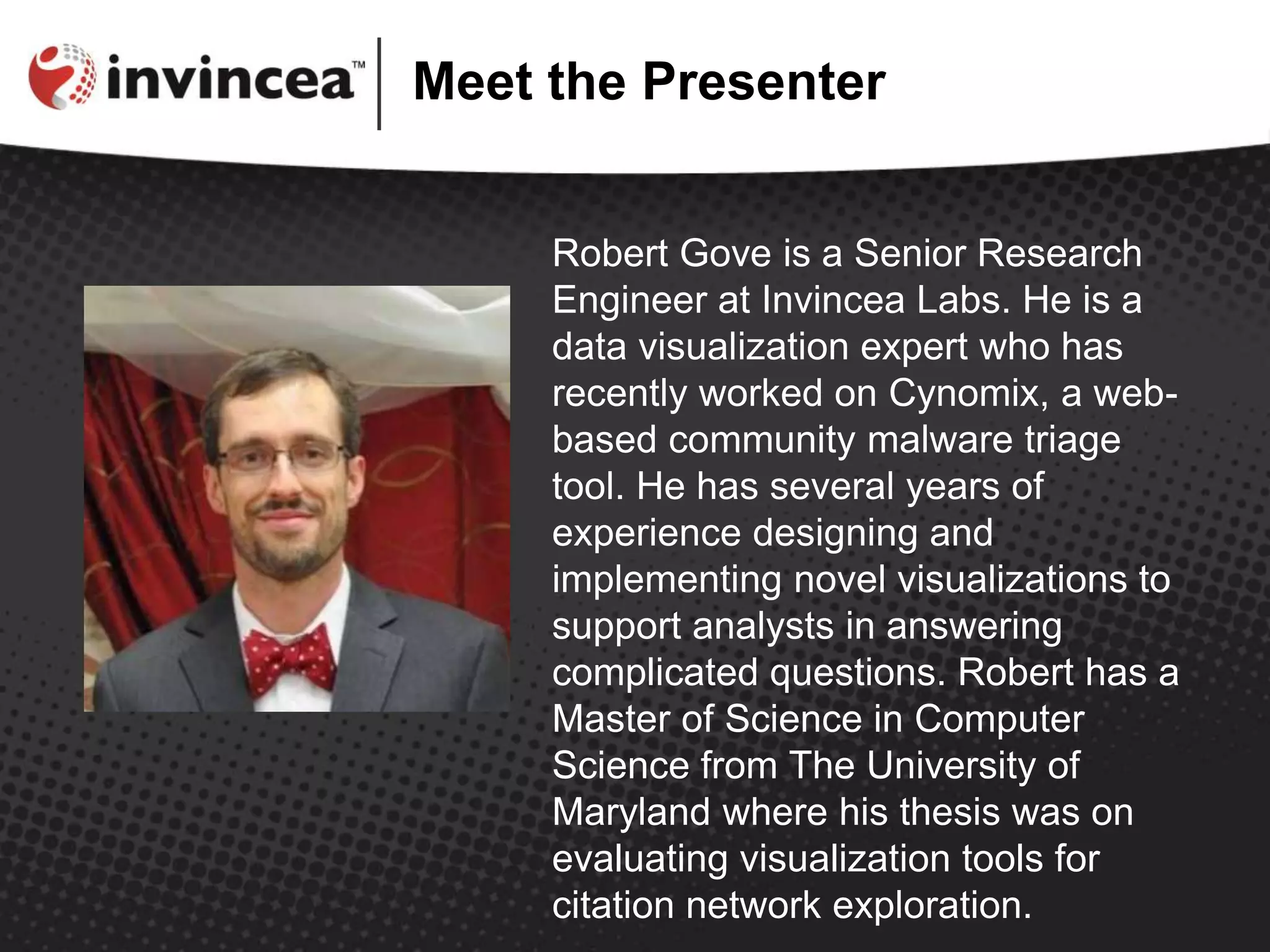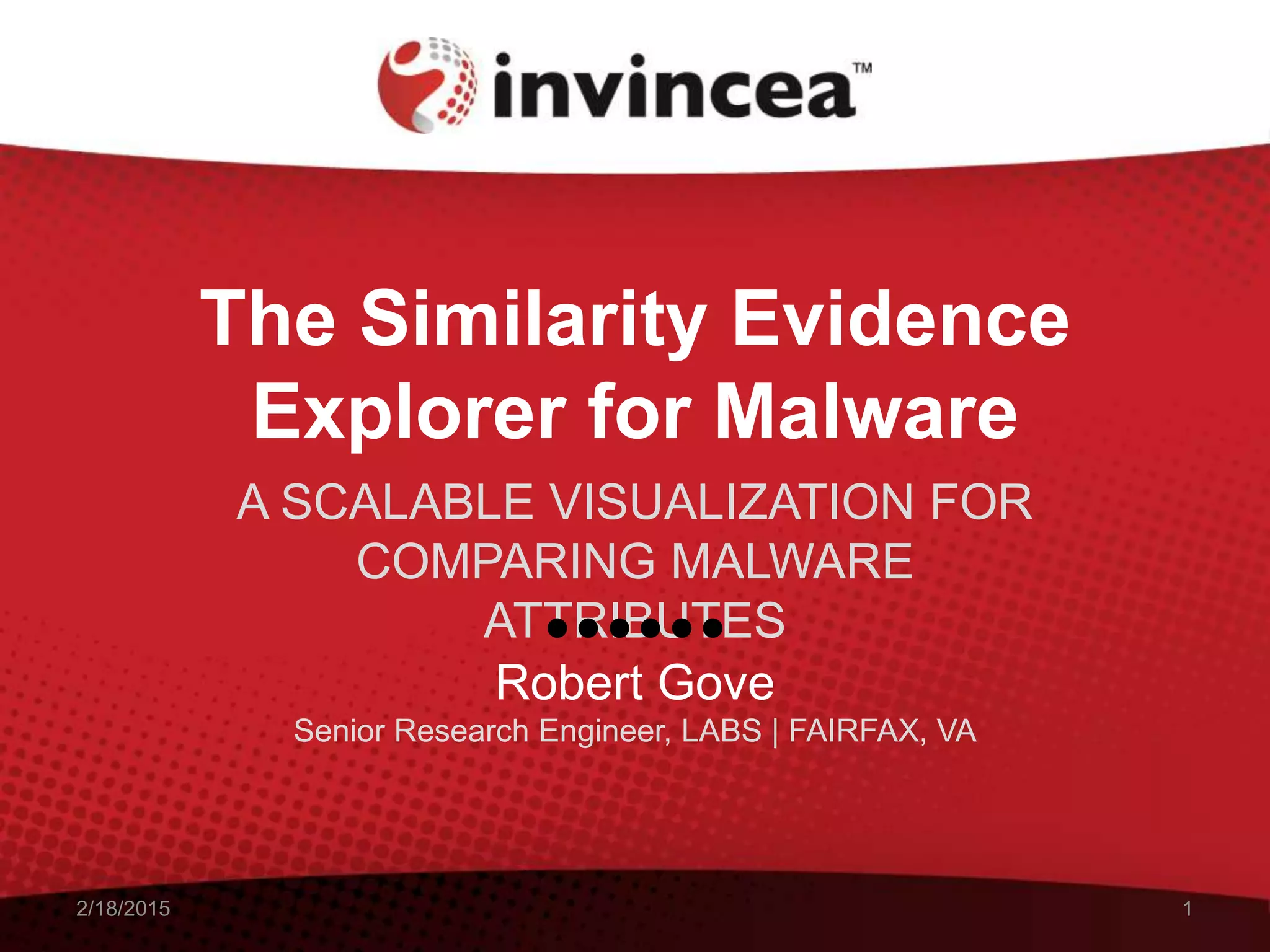 The document discusses the Similarity Evidence Explorer for malware, a data visualization tool developed by Robert Gove, aimed at aiding malware analysts in comparing malware attributes efficiently. The tool enables large-scale comparisons through features like histograms and detailed visualizations, facilitating the analysis of numerous malware samples. For further information and access to the tool, users are directed to the Cynomix website.