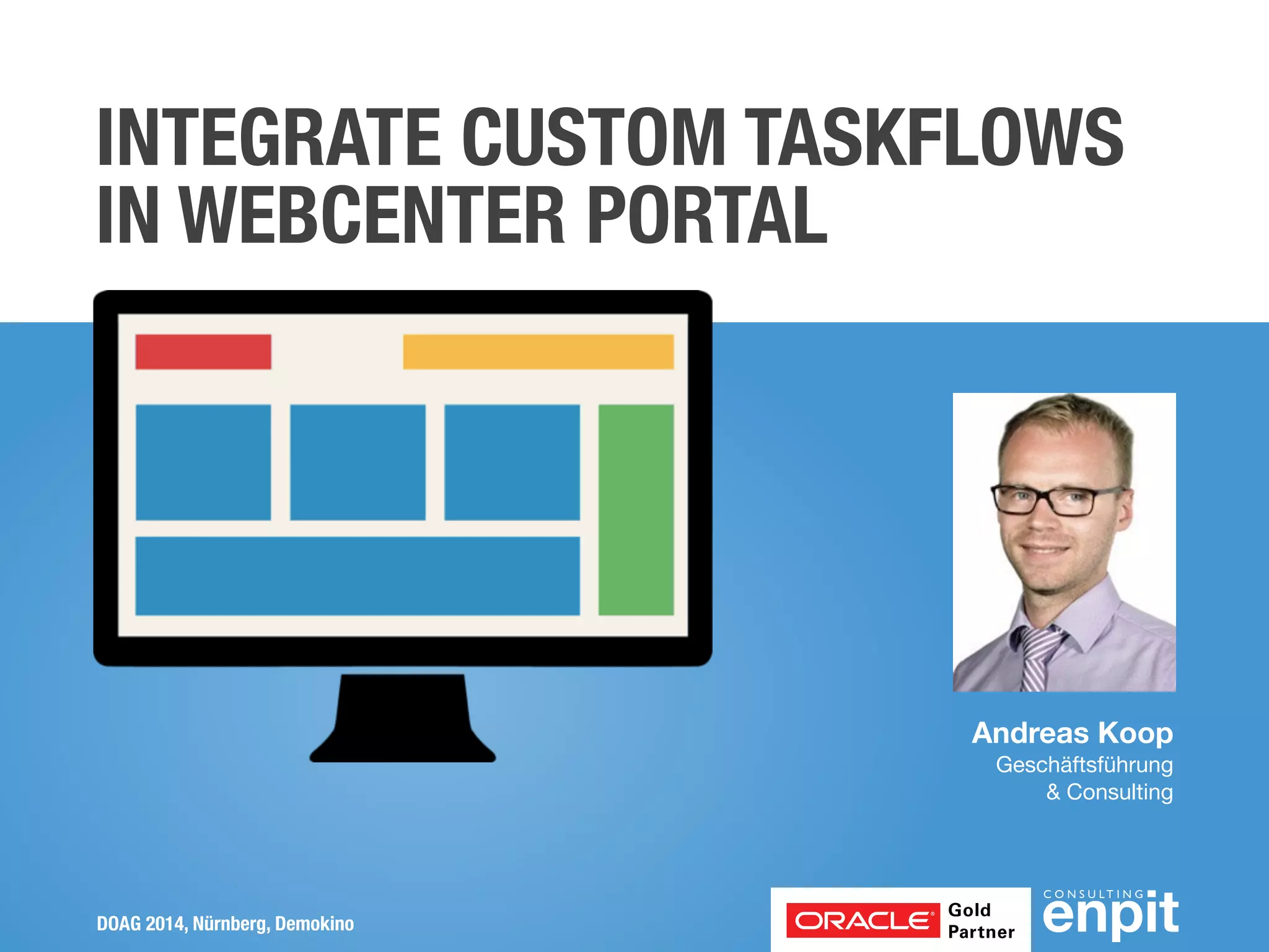 This document discusses integrating custom taskflows into Oracle WebCenter Portal. It outlines the overall development process, including developing taskflows in JDeveloper using web services or data sources, packaging them as a shared library WAR file, deploying the WAR to WebLogic Server, registering the library with the portal, adding the taskflows to the portal's resource catalog, and using them on portal pages. It also covers configuring datasources and web services in WebLogic Admin Console and Enterprise Manager to match the taskflow configuration.