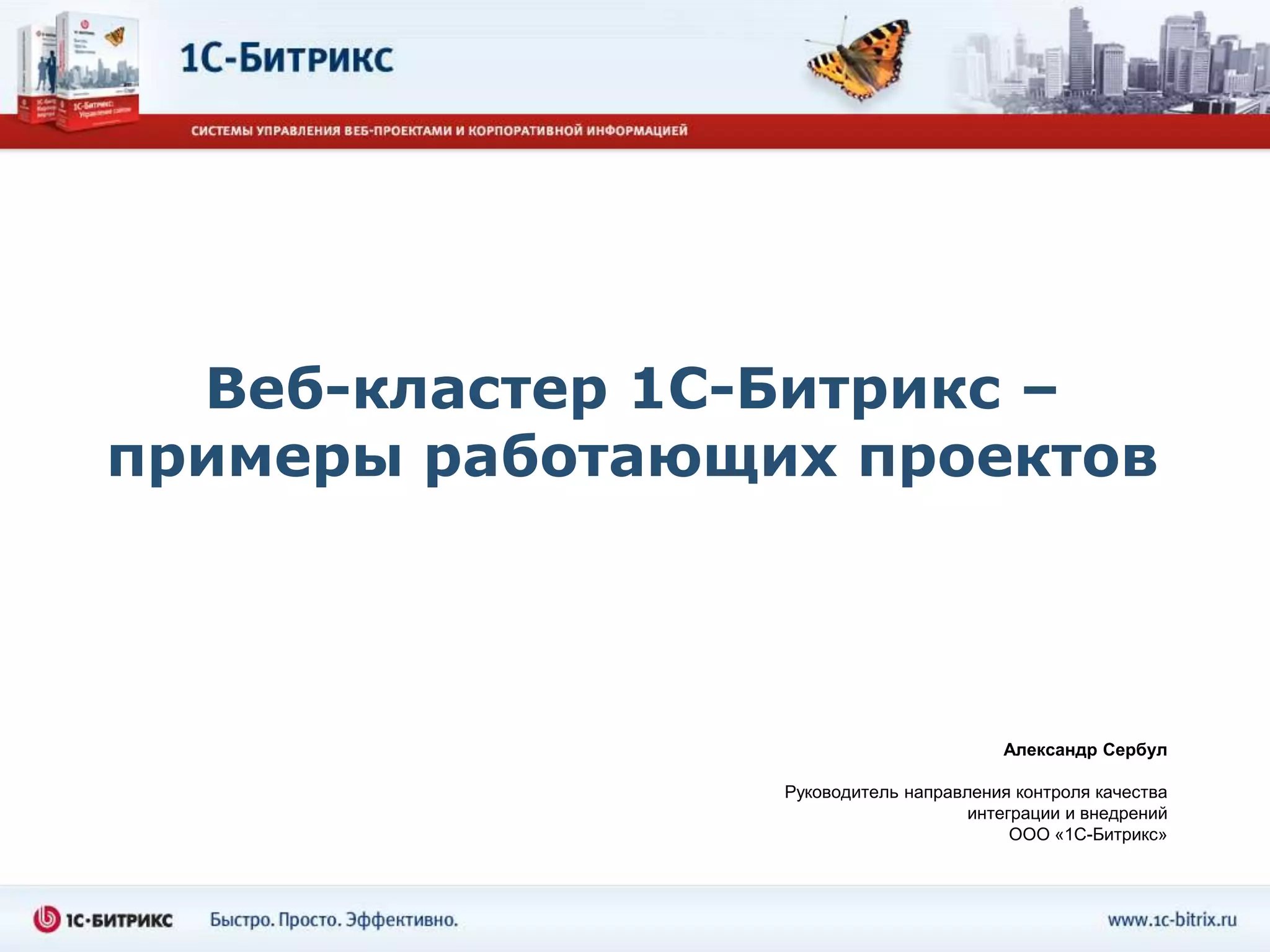 Документ описывает реализацию веб-кластера на платформе 1С-Битрикс, включая примеры успешных проектов, таких как kupibonus.ru и www.komos.ru, и подчеркивает важность высокой доступности и производительности. Приведены ключевые технические характеристики и архитектурные решения, направленные на обеспечение отказоустойчивости и масштабируемости. Также акцентируется внимание на значении интеграции с внешними сервисами и использовании современных технологий для оптимизации работы сайтов.