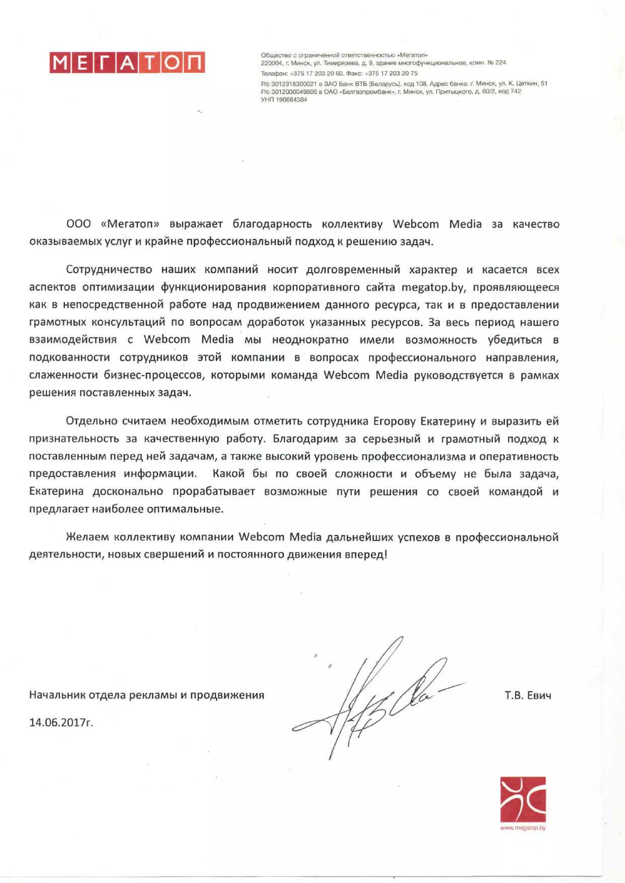 ООО «Мегатоп» выражает благодарность коллективу Webcom Media за качество оказываемых услуг и крайне профессиональный подход к решению задач. За весь период нашего взаимодействия с Webcom Media мы неоднократно имели возможность убедиться в подкованности сотрудников этой компании в вопросах профессионального направления, слаженности бизнес-процессов, которыми команда Webcom Media руководствуется в рамках решения поставленных задач. Отдельно считаем необходимым отметить сотрудника Егорову Екатерину и выразить ей признательность за качественную работу. Какой бы по своей сложности и объему не была задача, Екатерина досконально прорабатывает возможные пути решения со своей командой и предлагает наиболее оптимальные. Желаем коллективу компании Webcom Media дальнейших успехов в профессиональной деятельности, новых свершений и постоянного движения вперед!