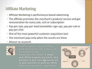 The document discusses how affiliate marketing can enhance brand equity by utilizing performance-based advertising where affiliates promote a merchant's products, receiving compensation for successful sales or actions. It emphasizes the importance of building relationships with affiliates to improve brand awareness, image, and performance, as well as the roles of different types of affiliates, such as superaffiliates and bloggers. Additionally, it highlights the significance of understanding affiliate motivations and managing these relationships to drive brand value creation and co-innovation.