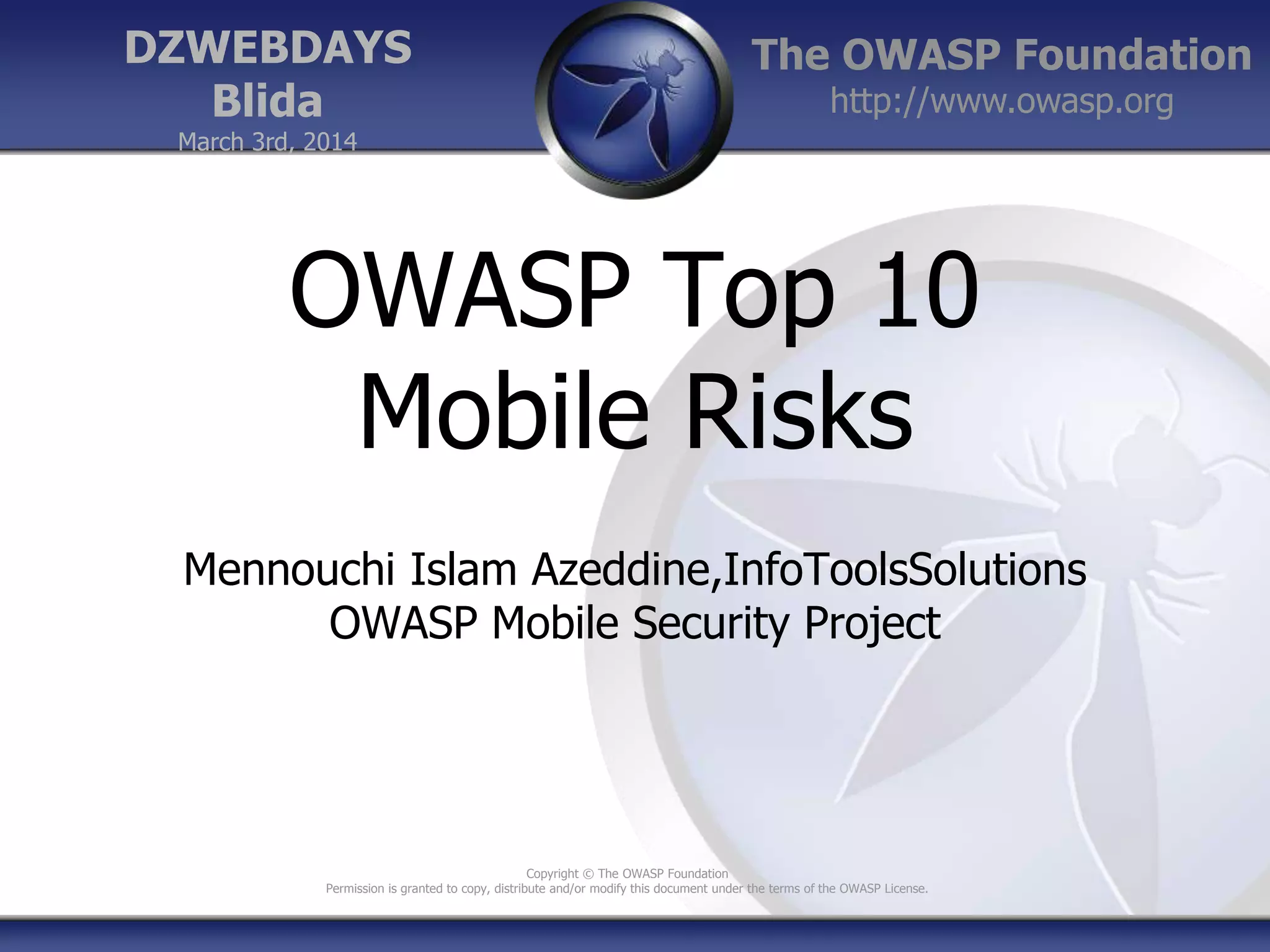 This document summarizes a presentation on mobile application security risks given by Mennouchi Islam Azeddine. The presentation covered the OWASP Mobile Security Project, a mobile threat model, and the top 10 mobile risks. It discussed each risk in the top 10 list, including insecure data storage, weak server-side controls, insufficient transport layer protection, client-side injection, poor authorization and authentication, improper session handling, security decisions via untrusted inputs, side channel data leakage, broken cryptography, and sensitive information disclosure. For each risk, examples were provided and prevention tips were outlined.