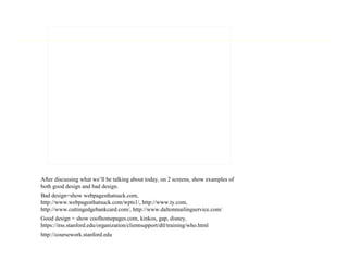 The document discusses best practices for web design, including considering users rather than just designers, and planning the site structure before development. It recommends prototyping designs, getting feedback, and reiterating. Specific guidelines covered include using accessible color combinations, clear navigation, flexible formatting, alternative text for images, proper semantic HTML, and "skip to" links. The document also provides examples of good and bad web design examples to demonstrate these principles.