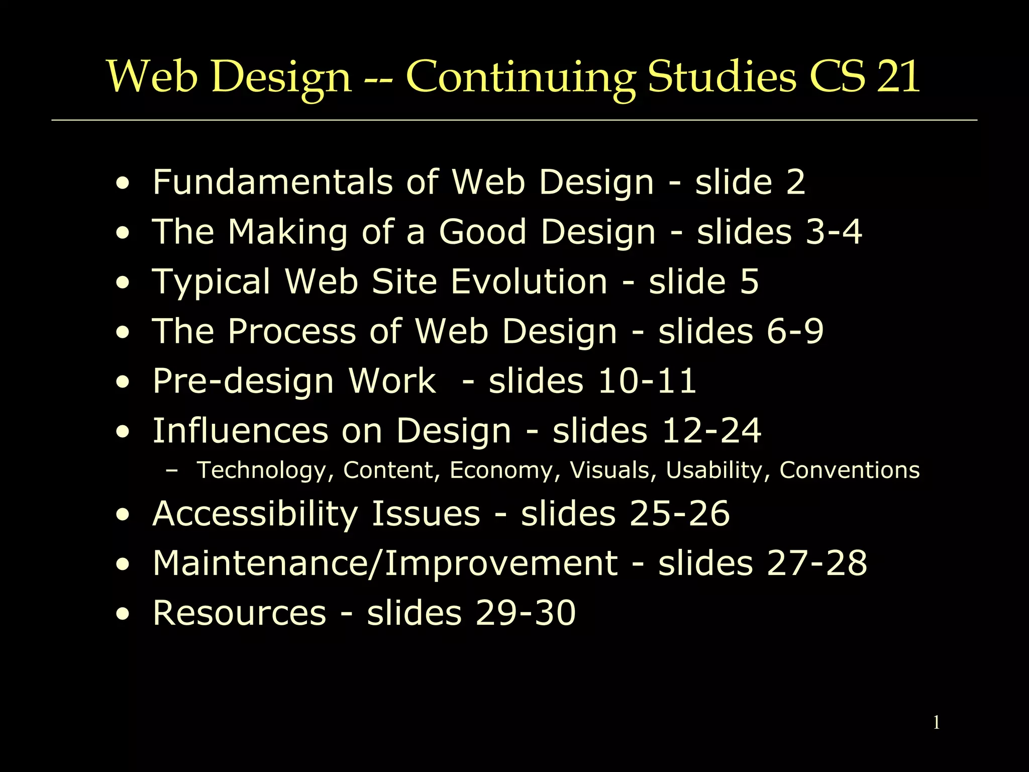 This document provides an overview of the fundamentals of web design. It discusses the influences on design such as technology, content, usability and conventions. It also covers the typical evolution of websites, the design process, pre-design work, accessibility issues and maintenance. Key aspects of good design include understandability, usability and meeting the needs of website visitors. The document recommends a methodical design process over an ad-hoc one to avoid common pitfalls.