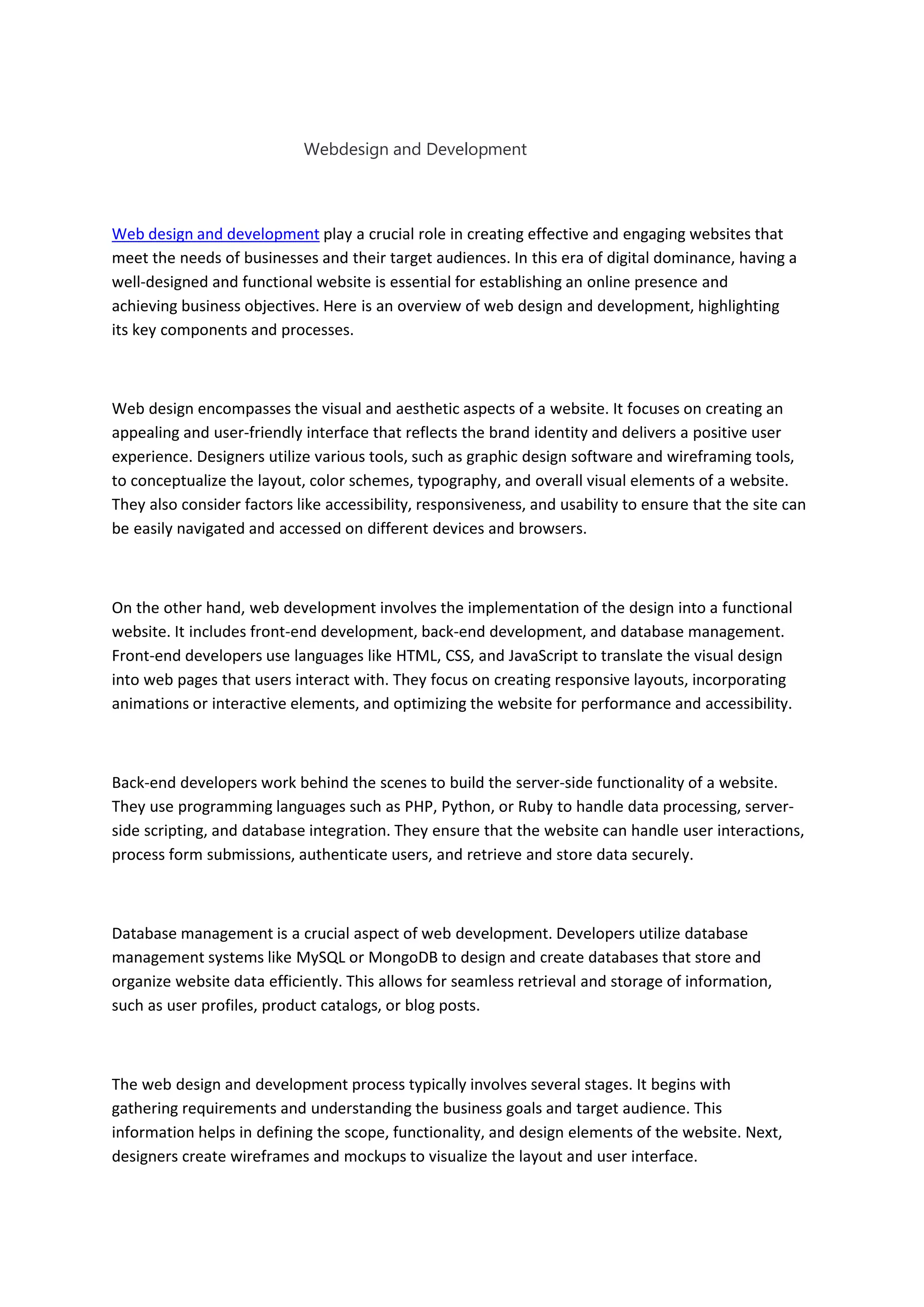 Web design and development are essential for creating effective websites that fulfill business needs and engage users. Web design focuses on aesthetics and user experience, while web development involves implementing functionality through coding and database management. The process encompasses requirement gathering, design creation, coding, testing, and ongoing maintenance to ensure the website remains secure and effective.