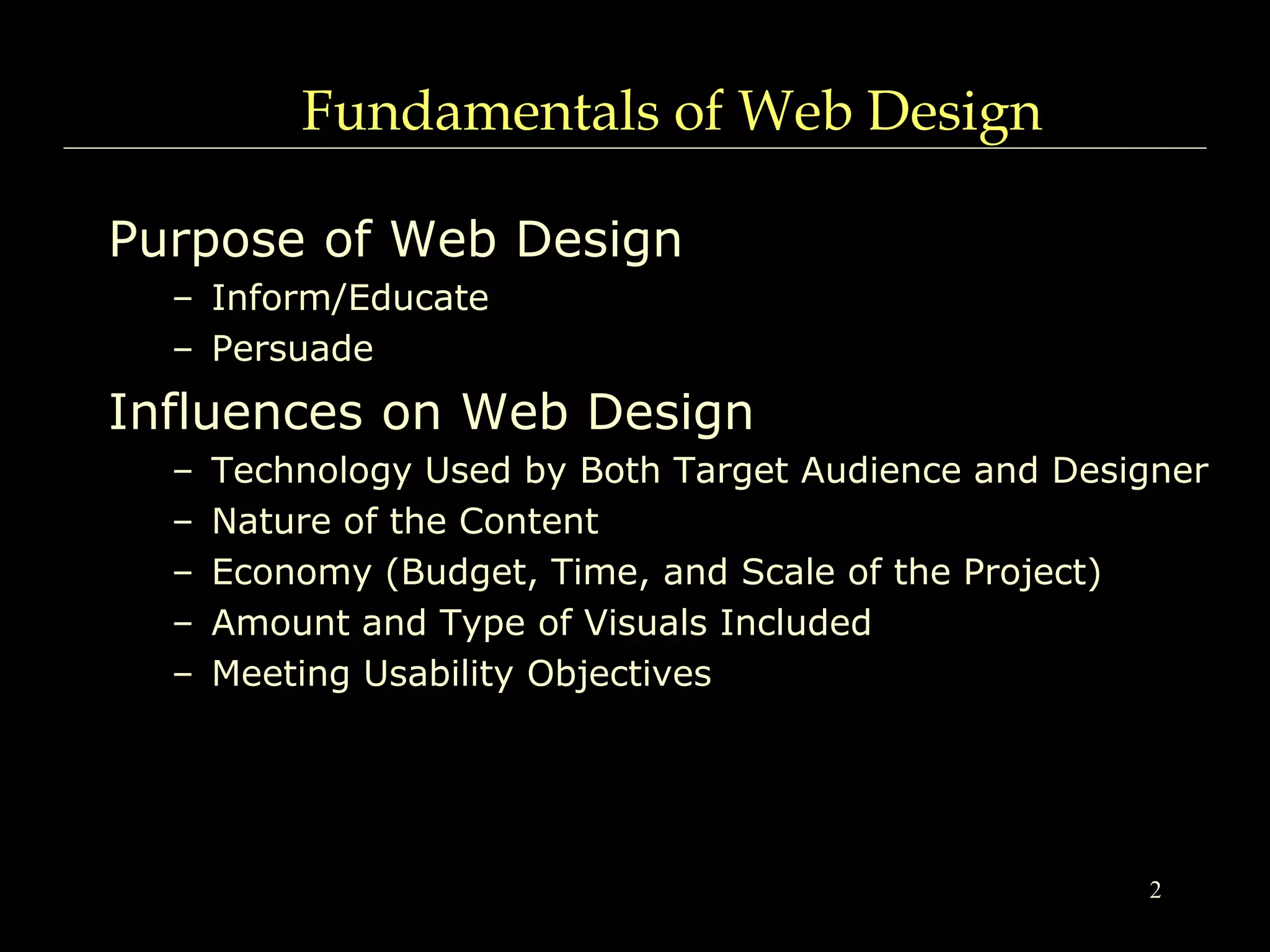 This document outlines the process of web design, including pre-design work like defining goals and audiences, influences on design like technology and content, and best practices. It discusses fundamentals like usability, accessibility, and maintenance. The typical evolution of websites is also examined, emphasizing the importance of careful planning over an ad-hoc approach. Key stages in the design process include content organization, wireframing, approvals, and ongoing maintenance.