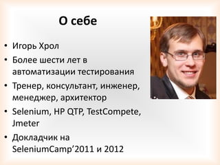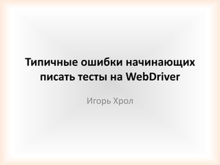 Документ описывает распространенные ошибки начинающих разработчиков тестов с использованием Selenium WebDriver и предлагает рекомендации по улучшению кода тестирования. Автор, Игорь Хрол, делится своим опытом в автоматизации тестирования и акцентирует внимание на важности правильного написания методов и использования конвенций языка программирования. Также обсуждаются вопросы синхронизации, выбор между XPath и CSS-селекторами, а также общие ошибки в программировании.