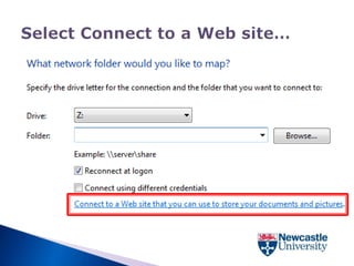 The document provides instructions for accessing campus files from home using Windows 7 and includes a link for Mac and PC users. It explains the process of mapping a network drive using campus ID and password, detailing steps such as clicking next and being patient during the loading phase. The document emphasizes dragging and dropping files into the mapped drive once access is granted.