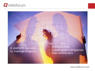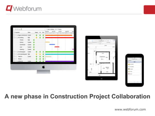 This document introduces Webforum, a new online platform for construction project collaboration. It provides a complete dashboard for managing projects, including document management, communication tools, progress tracking, cost reporting, and risk management. The platform allows asset owners, construction companies, and subcontractors to collaborate throughout a project. It offers features like permissions control, searchable document archives, task management, and mobile access. Webforum is presented as an affordable and scalable solution to improve efficiency on construction projects of all sizes.