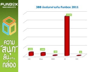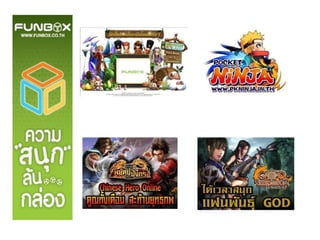 ค่ายเกมออนไลน์ทั่วฟ้าเมืองไทย+Webgame 1. 2. Decision maker : คุณภัทธีรา อภิธนาคุณ TOP Management : คุณภัทธีรา อภิธนาคุณ 2012 mission เปิดตัวอีก 3 – 5 game online (Web flash + Client) 3. 4. Mstar แนวเกมเต้น เน้นการแต่งตัวและความสนุกสนานในการเต้นรำ Pangya (United) แนว Golf Sport ตัวละครน่ารักสดใส Flyff (rewind XIV) MMORPG แนวน่ารัก พจญภัย Boomz web based shooting game War2 แนว เกมวางแผน Yogurting MMORPG ตัวการ์ตูนน่ารัก คล้ายเกม Flyff Cocking Papa เกมทำอาหาร Online อันดับหนึ่งของไทย Flyff Pangya MStar MStar Boomz 5. 6. Insight Information Ini3 facebook 4,109 fanpage, twitter 116 Follwers มี Social webboard เป็นของตัวเอง http://www.mysquare.in.th/index.php ซึ่งเป็นคู่แข่งกับ www.playpark.com ของ ASIASOFT โดยตรง ini3 เป็นบริษัทในเครือของ Galaxy Group ผลการดำเนินงานคาดการณ์ 300 - 500 MB ( อันดับ 3 ผู้ให้บริการเกมไทย ) กำไรสุทธิปี 54 จะประมาณ 50-100 MB สิทธิประโยชน์ร้านเกมส์ ไม่เก็บค่าลิขสิทธิ์เกม , ตกแต่งร้านให้ , และมี Marketing Material ให้ , มี Special item ร้านเกมให้ 7. Decision maker : คุณสมเจตน์ เศรษฐพินิจ TOP Management : คุณสมเจตน์ เศรษฐพินิจ 2012 mission เปิดตัวอีก 4-6 game online 8. Product (top game online) - PERFECTWORLD - Zhuxian เกมจีน Steps Evolution เกมเต้นคล้ายๆ Audition Chibi แนวสามก๊ก ศึกสามแผ่นดิน King of Kings 3 MMORPG ทำศึกเสมือนจริง - Dreamland Forsaken World MMORPG ตัวละครเป็นตัว การ์ตูนสวยงาม Forsaken World Forsaken World KOK3 Step Evolution PERFECTWORLD 9. ระบบการเติมเงิน เติมเงินผ่าน ... สิทธิประโยชน์ร้านเกมส์ ไม่เก็บค่าลิขสิทธิ์เกม และมี Marketing Material ให้ , มี Special item ร้านเกมให้ Q-WORLD MMORPG การ์ตูน 10. Insight Information Cubinet facebook 3,799 fanpage ผลการดำเนินงานรายได้ทั้งในประเทศและต่างประเทศ 400-500 MB ( อันดับ 5 ผู้ให้บริการ ) กำไรสุทธิปี 54 จะประมาณ 150 MB (domestic) Business Partner : G-View และ 3BB Webboard ( รวมทุกเกม ) ที่ให้บริการลูกค้ามีสมาชิก 33,184 คน King Of King 3 BEST MMORPG ได้รับเลือกเป็น “ เกม RPG ยอดเยี่ยมแห่งปี ” ปีหน้าจะเปิด 3-5 เกม ( Client base) เน้นการจัด activity กับร้านเกม 11. Decision maker : คุณปราโมทย์ สุดจิตพร Management : คุณพจน์ พันธ์ศิริพจน์ Products Grand Chase, Chinese Hero, Rappelz, 3 Kingdoms , 3Kwar, GOD OF EMPEROR, POCKET NINJA 12. 13. 14. 15. 16. 17. Decision maker : คุณปราโมทย์ สุดจิตพร Management : นายมานะ ประภากมล Products HIPSTREET FIFAONLINE KARMA KARTRIDER SPECIALFORCE 18. Mission:2012 Magic World 2 Online จับ วัยรุ่น - วัยทำงาน ตั้งเป้าขยับส่วนแบ่งตลาดแตะ 30% ระบุตลาดรวมโตเฉลี่ย 10% ทุกปีดึงดูดผู้เล่นหน้าใหม่ร่วมวงชิงเค้ก เน้นแข่งขันกันเอง ความแปลกใหม่ของเกม มีมูลค่ารวมตก 3,000 ล้าน เติบโตไม่น้อยกว่า 10% ทุกปี คาดว่าจะทำให้มีส่วนแบ่งในตลาดเกมออนไลน์เพิ่มขึ้นเป็น 30% หรือมีรายได้ 900 ล้านบาท ภายในปีหน้า จากที่มีส่วนแบ่ง 23% หรือ 714 ล้านบาท ของมูลค่าตลาดรวมที่ 3,000 ล้านบาท 19. 20. Information : บริษัท ทรู ดิจิตอล พลัส จำกัด เป็นบริษัทในเครือของบริษัท ทรู คอร์ปอเรชั่น จำกัด ( มหาชน ) ปัจจุบันบริษัทมีส่วนแบ่งในตลาดเกมออนไลน์เป็นอันดับ 2 มีฐานผู้เล่นเกมประมาณ 2 ล้านคน เน้นให้บริการน้อยเกมแต่มีการพัฒนาสม่ำเสมอ โดยเกมที่เลือกนำเข้ามาให้บริการที่ผ่านมาจะเป็นเกมที่สามารถเพิ่ม