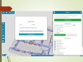 The document outlines the development of a web-GIS based utility management system designed to effectively manage complex utility networks in Pokhara, Nepal. The system utilizes drone surveying, GPS data, and various software tools to create a spatially linked database for better service delivery. Key challenges include technological limitations and the lack of maintained utility data, while recommendations focus on establishing a central database system involving local authorities and service providers.