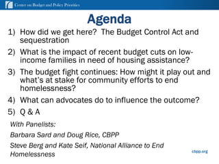 This document summarizes a presentation on the impact of budget cuts to housing assistance programs. It discusses how the Budget Control Act led to automatic spending cuts (sequestration) that have significantly reduced funding for programs like housing vouchers. As a result, hundreds of thousands fewer families are receiving housing assistance. Advocates are urged to contact members of Congress to emphasize how cuts threaten efforts to end homelessness and ask that housing programs be prioritized in any budget deal. Restoring funding could help maintain assistance for vulnerable groups and prevent increased homelessness.