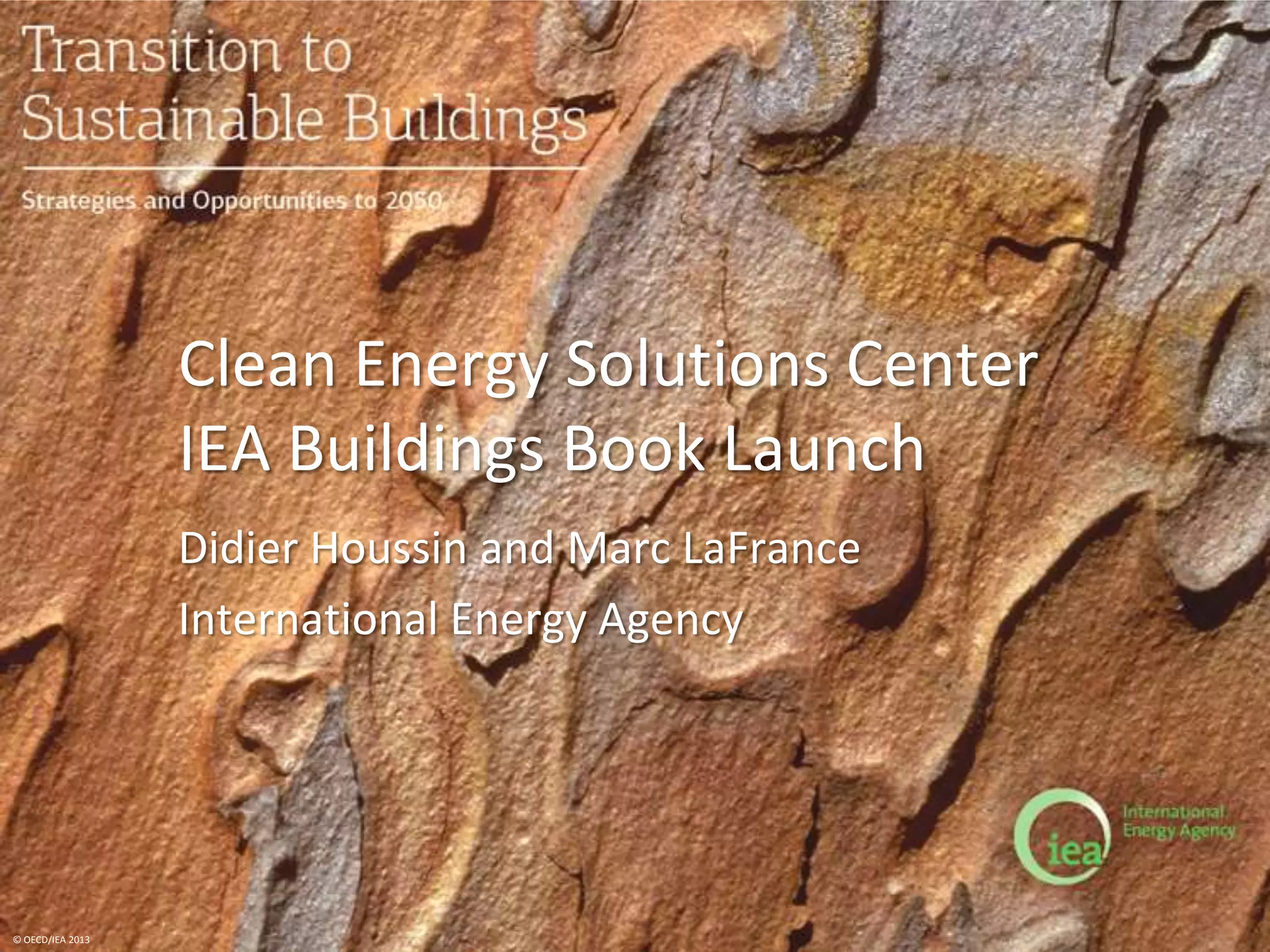This document summarizes key findings from the IEA's book on transitioning to sustainable buildings. It finds that buildings are the largest end-use sector for energy and that demand is projected to rise 50% by 2050 without new policies. The book outlines a scenario where stringent new building codes and retrofitting of existing buildings could reduce energy demand in buildings by 25% by 2050 through commercially available technologies. This would realize energy savings of 40 exajoules and emissions reductions of 9 gigatons of CO2 per year primarily through fuel switching and efficiency improvements in space and water heating, cooling, lighting, and appliances. The recommendations focus on policies like building codes, standards for equipment and appliances, and technologies such as heat pumps