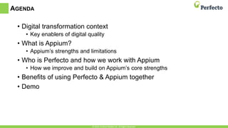 This document discusses how Appium and Perfecto can work together to improve mobile application testing. It summarizes Appium as an open-source tool for automating mobile tests but notes its limitations in enterprise settings due to lack of support and controls. Perfecto is introduced as a cloud-based platform that provides the infrastructure and capabilities needed for robust enterprise mobile testing at scale. The document argues that combining Appium's test automation with Perfecto's device lab, controls, and reporting removes Appium's limitations and allows for complete automated testing of mobile applications under real user conditions.