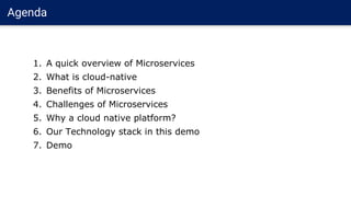 The document provides an overview of microservices and cloud-native architecture, highlighting their benefits, challenges, and essential goals for modern applications. It emphasizes the importance of a cloud-native platform that supports easy deployment, observability, and automation. Additionally, it includes links to demo applications and invites organizations to engage with Zekelabs for employee upskilling in IT.