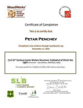 Petar Penchev completed a live webinar through woodworks.org on November 11, 2015. The webinar was titled "A 21st Century Iconic Glulam Structure: Cathedral of Christ the Light" and was presented by Paul Gilham. Petar Penchev received 1 AIA/CES LU or PDH credit for completing the webinar.