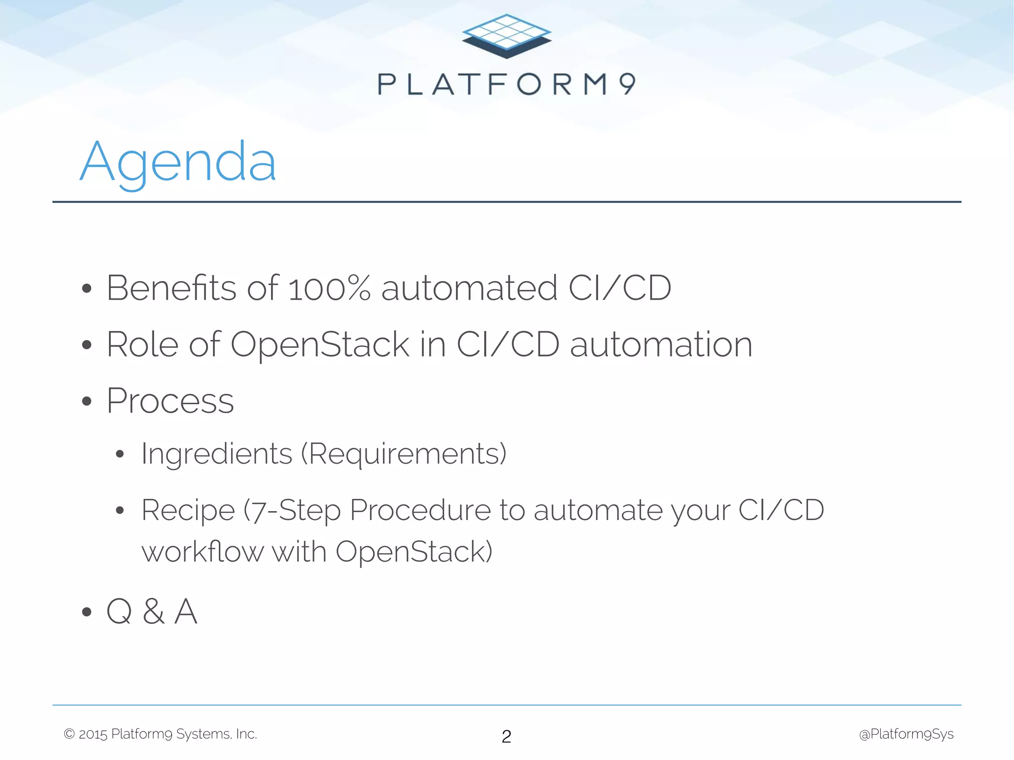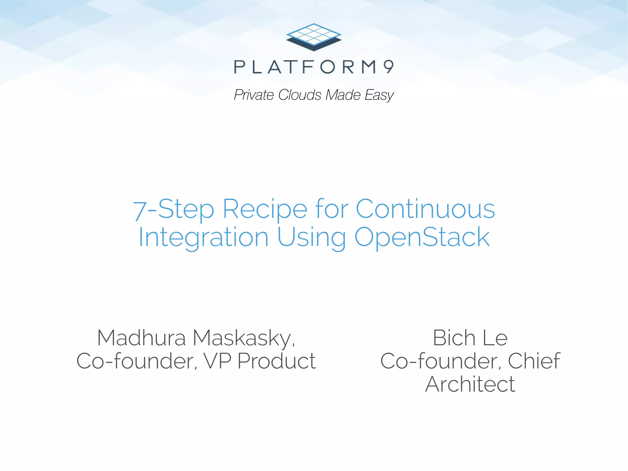 This document outlines a 7-step recipe for automating continuous integration and delivery (CI/CD) using OpenStack private clouds, highlighting the benefits of a fully automated process. It emphasizes improved developer efficiency, high-quality code delivery, and resource management through end-to-end automation. The document also features the speakers' backgrounds and encourages readers to try the Platform9 service for CI/CD automation.