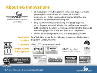 EG Innovations offers a performance management solution designed to diagnose, fix, and prevent performance issues in virtualized IT environments, enhancing user satisfaction and ROI. Their automated root-cause diagnosis technology provides visibility across various infrastructure components, allowing preemptive problem resolution and capacity planning. The service supports organizations in optimizing their Citrix investments, increasing adoption rates, and ensuring exceptional desktop transformation outcomes.