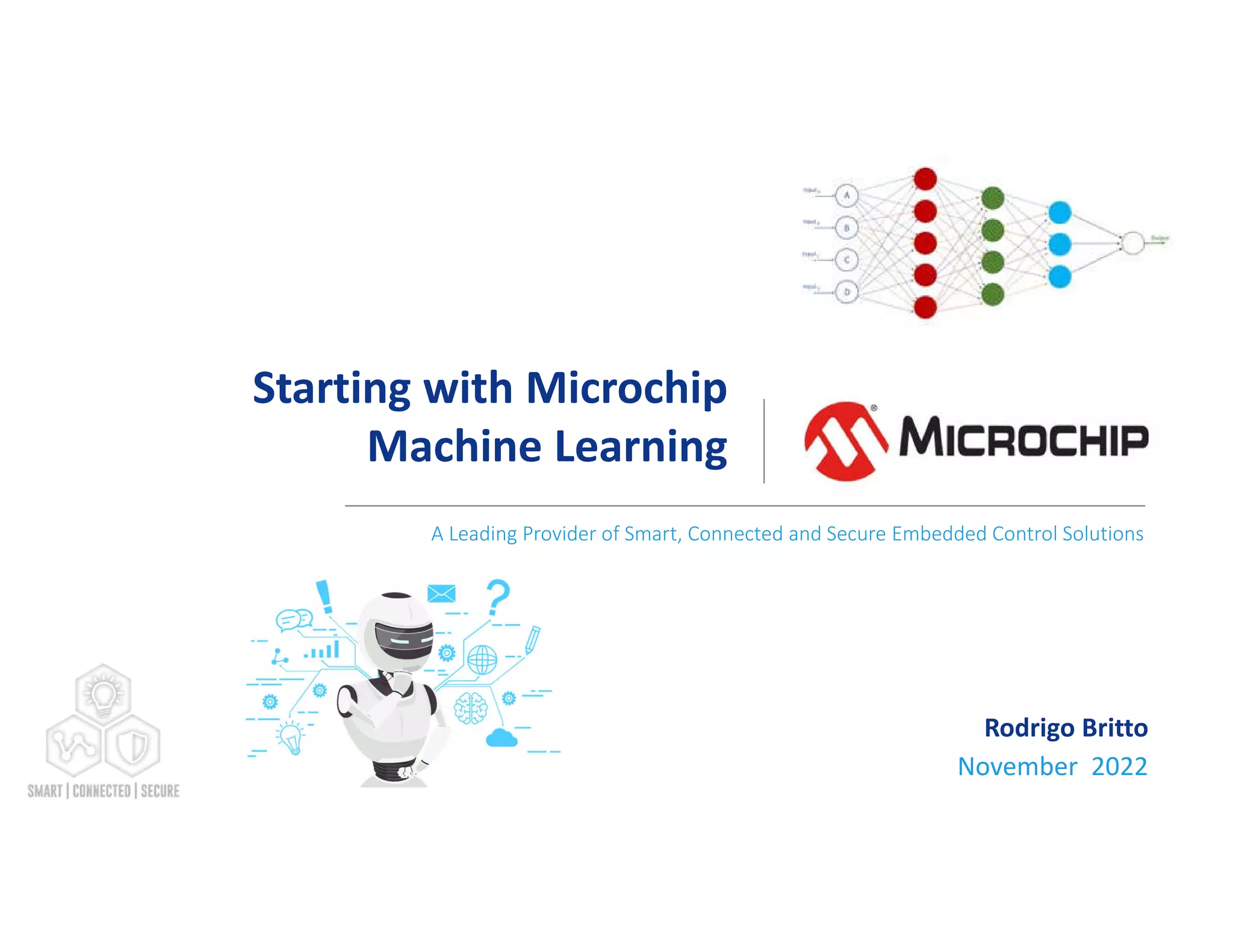 The document provides detailed information on Microchip's embedded development tools and machine learning solutions, including the MPLAB X IDE, various compilers, and the MPLAB Harmony framework. It outlines numerous demos and evaluation kits available for machine learning development, specifically highlighting TensorFlow Lite for microcontrollers and the workflow for gesture recognition using the SAMD21 ML evaluation kit. Additionally, it covers setup instructions, licensing options, and integration strategies for using Sensiml's toolkit with Microchip platforms.