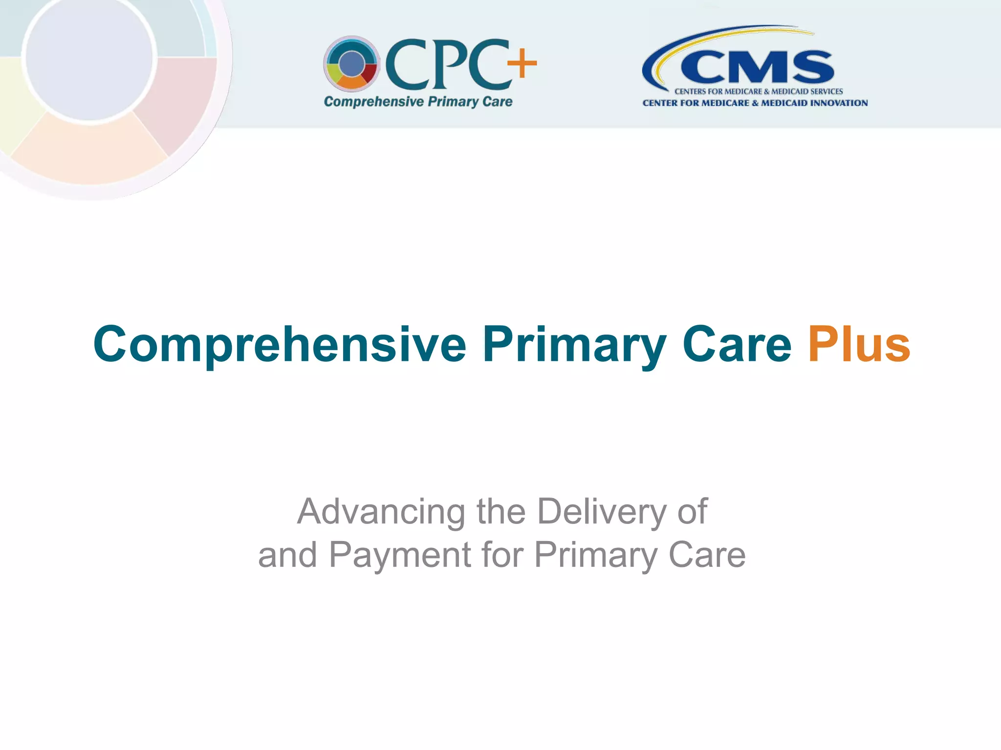 The Comprehensive Primary Care Plus (CPC+) initiative aims to enhance primary care delivery and payment systems to support practices in providing comprehensive care, especially for patients with complex needs. It includes two tracks to accommodate varying levels of practice readiness, with Medicare partnering with multiple payers to align incentives and support improved care delivery. Practices may apply to participate in July 2016, with specific eligibility requirements and support from health IT vendors integrated into the program.